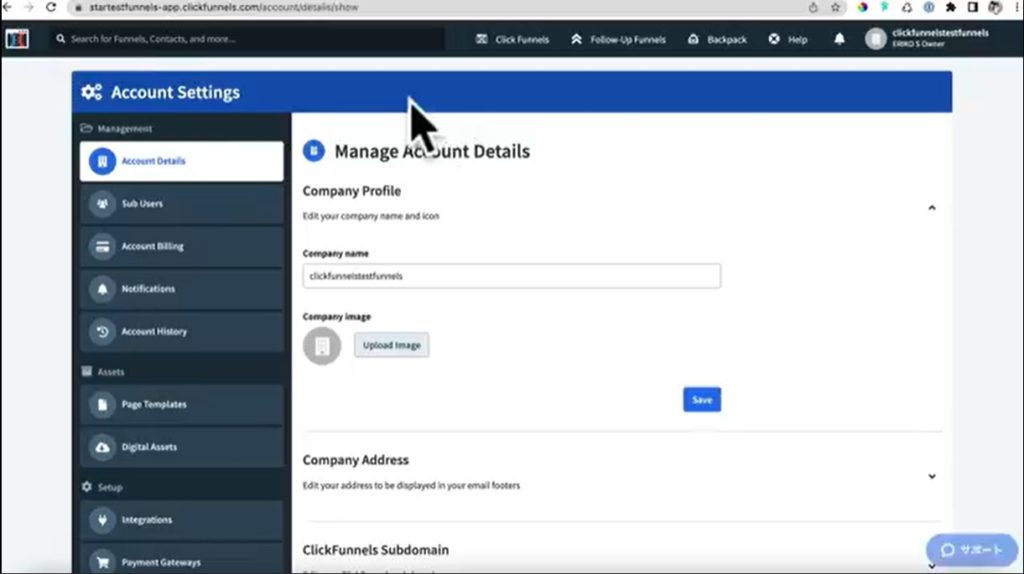 まずは上の画面をご覧ください。こちらはClickfunnelsのダッシュボードです。右上の「ClickFunnelstestfunnels」をクリックすると、メニューが表示されます。その中から「Account Setting」を選択してください。
