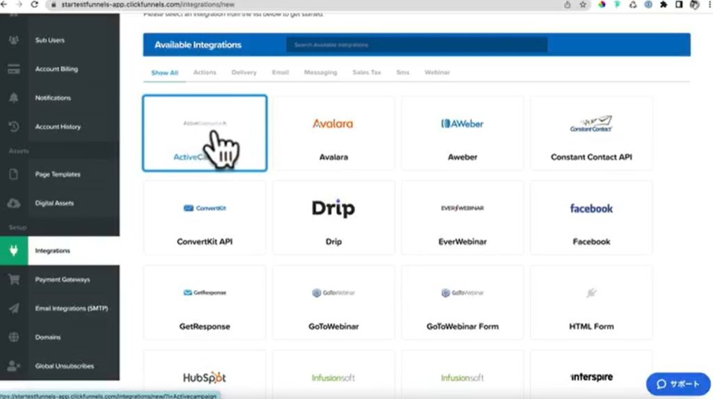 このようにClickfunnelsと連携できるいろいろなツールが表示されます。上のスクショのカーソルの指し示しているところに、ActiveCampaignがあります。こちらをクリックしましょう。