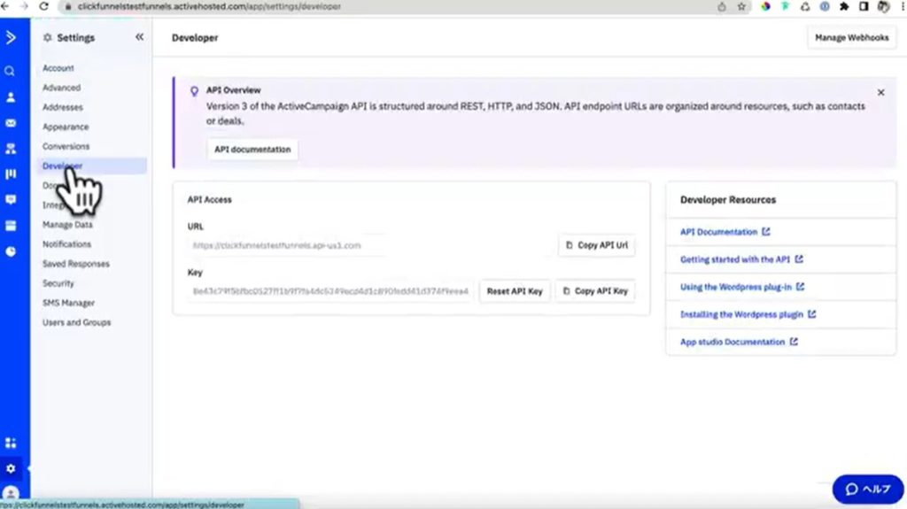 画面の中央部を見ると、「API Access」という項目があるでしょう。その中に「URL」と「KEY」という欄があるはずです。これらの情報がClickfunnelsと連携する際に必要となる情報です。