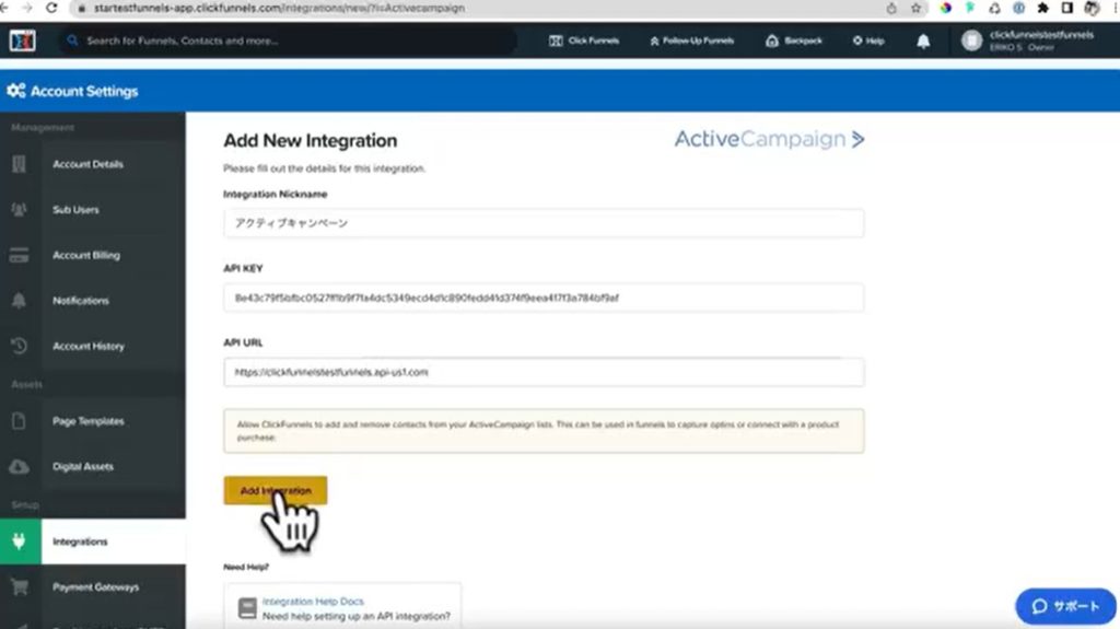 ActiveCampaignでAPI KEYとAPI URLをコピペすると、上のスクショのようになるはずです。このように必要な情報を入力できれば、下部の「Add Integrations」をクリックしてください。