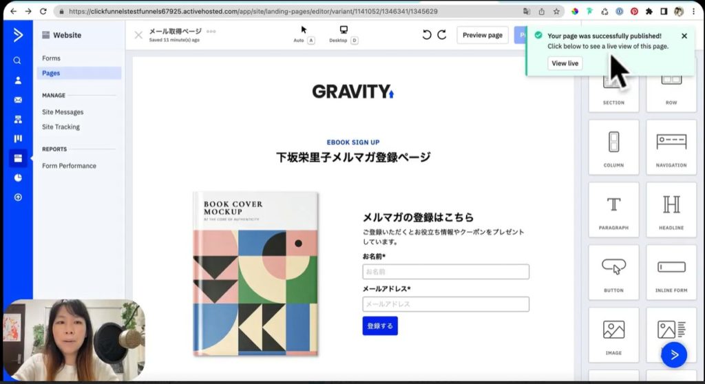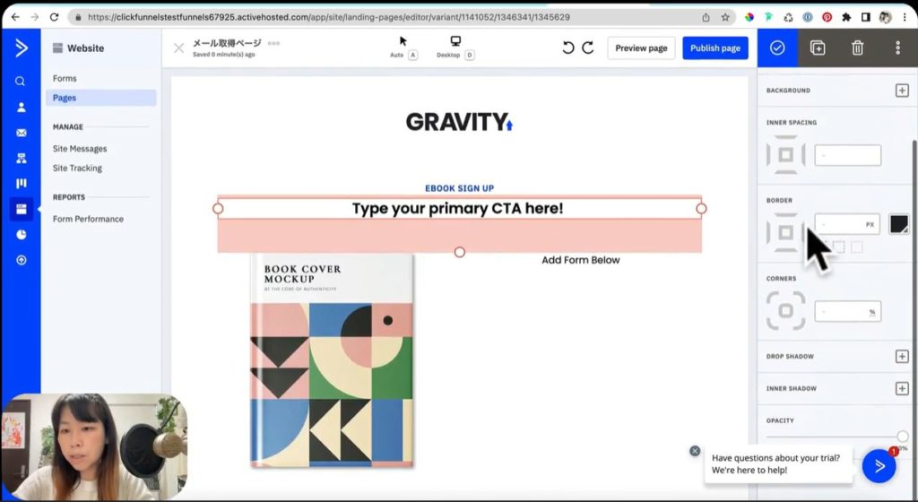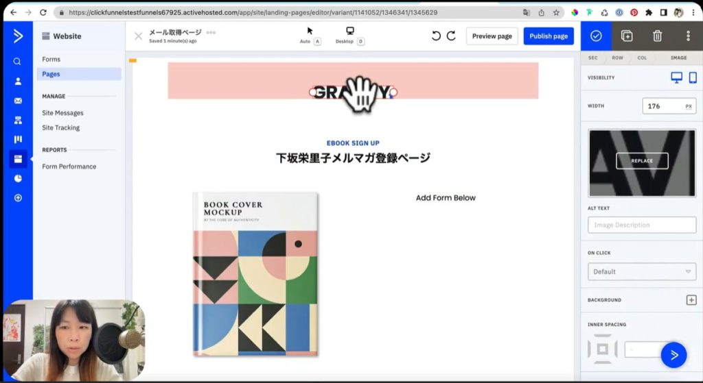 今回は一例として、タイトルの「Type your primary CTA here!」というテキストを上のスクショのように「下坂栄里子メルマガ登録ページ」に変更してみました。該当の場所にカーソルを合わせてクリックして、文字入力するだけで変更できるのでそれほど難しくはありません。