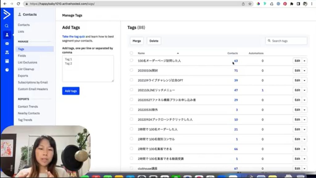 上の画像をご覧ください。こちらは私が実際に管理しているActiveCampaignのタグの画面です。いろいろなプロモーションなどを開始する際には、お客様にタグをつけて管理するようにしています。