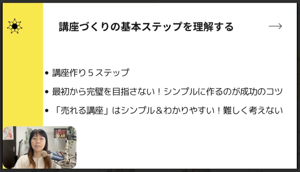なので、過重な提供は不満を逆に呼んでしまったり、結局「学んだけどできなかった」みたいなことになってしまうのは悲しいことなので、できるだけシンプルにしてみてください。以上が「講座作りの基本ステップ」になります。ぜひシンプルに素早く講座を作っていただければと思います。