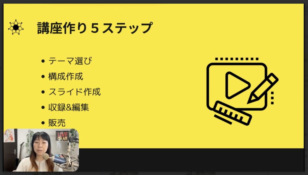 そして書き出しが終わったら、次は「スライド作成」です。このスライド作成というのは、スライドなしでやる方はなくても大丈夫です。私はだいたい、上の画像のようなスライドも作って説明をしていくスタイルですので、スライドも作成をしています。でも、使わない方はなしでも大丈夫です。