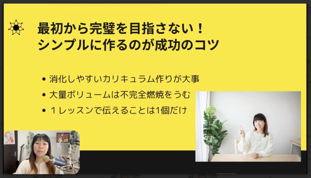 そして、重要なマインドセットをお伝えします。「最初から完璧を目指さない!シンプルに作るのが成功のコツ」についてです。実はオンライン講座を作ろうというふうに思っても、挫折してしまう人も多いです。実際に私の場合も、ノってる時はすぐ作れたりするんですが、ノってない時はなんか2、3ヶ月寝かしてしまったりするんですね。
