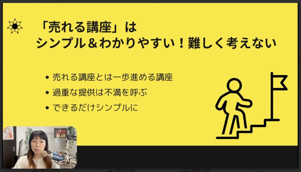 そして、講座を作る時は”階段を登るイメージ”をしていただきたいんですが、あなたが教えたいことがゴールにあるとします。じゃあ、それを習得するには「どういうステップで学んでいったら、お客様がこれを理解できるかな?」というふうに考えていただくことがオススメです。