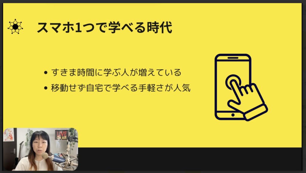 まず最初に「スマホ1つで学べる時代」についてです。今って、スマホで学べる時代になりましたね。あなたもスマホを持っているんじゃないでしょうか。こういった”すきま時間”で学ぶ人が非常に増えているんですね。人々は歴史背景の中で大変忙しくなっています。自分の時間を確保するのも大変なくらい忙しくなっていたり、多様化が進む中でいろんな趣味を見つけやすくなりました。