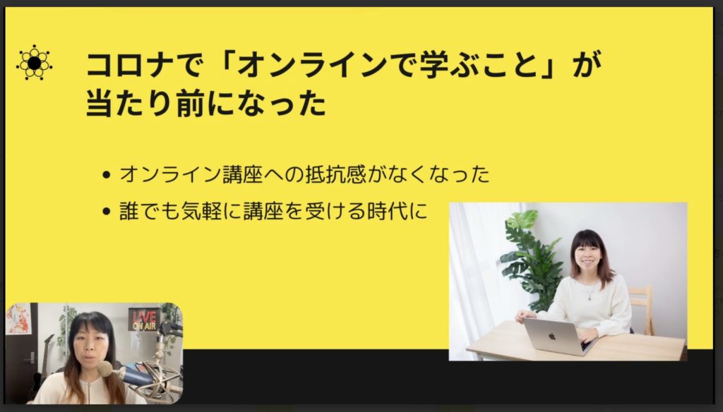 「オンラインで学ぶこと」が当たり前になったんです。つまり、人々もオンラインで学習することや、オンラインからノウハウを学ぶことへの抵抗感がなくなりました。その結果、誰でも気軽に講座を受けられる時代になったんです。