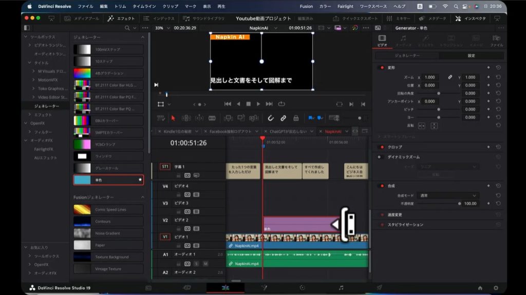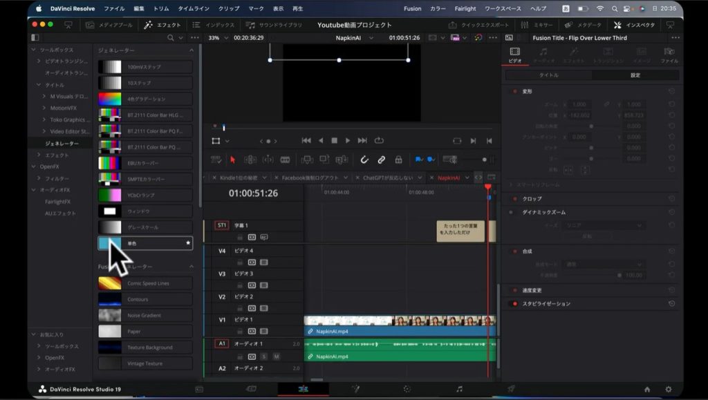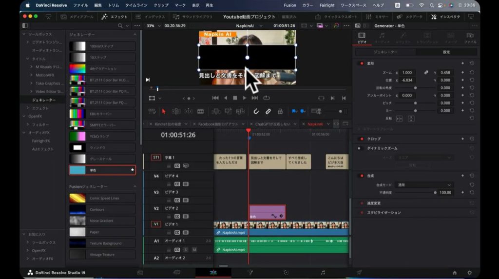 背景を入れるには、まず「エフェクト」を選択しましょう。すると左側にいろいろなメニューが出てくるので「ジェネレーター」をクリックしてください。次にその右隣にジェネレーターのメニューが出てくるので、以下のスクショのように「単色」を選択しましょう。