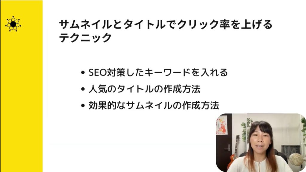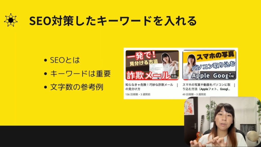 これは数字を盛り込むことで、明確に伝わりやすいからです。伝わりやすいキーワードを入れることで、この動画を見れば具体的にどのようなことができるのかといったことを意識してみました。