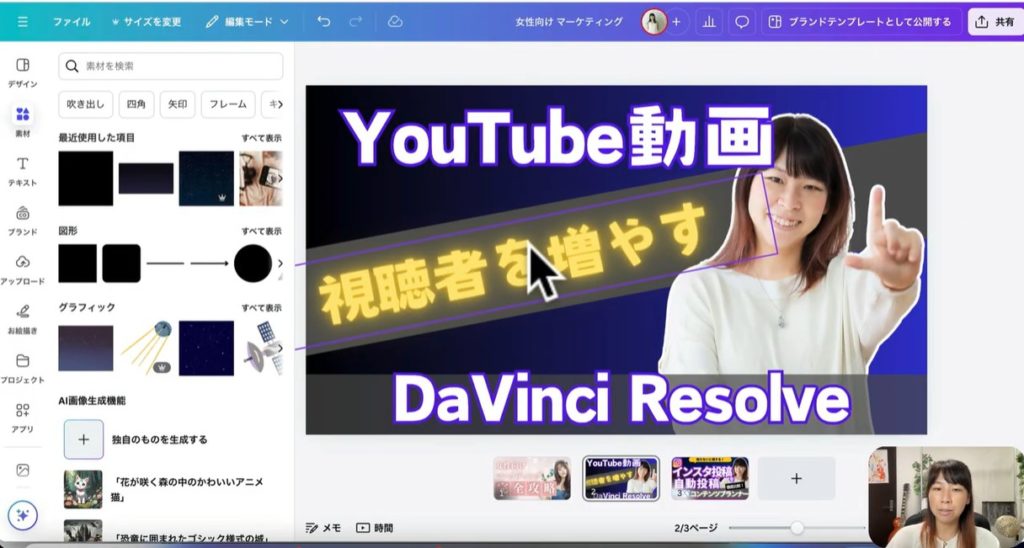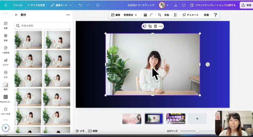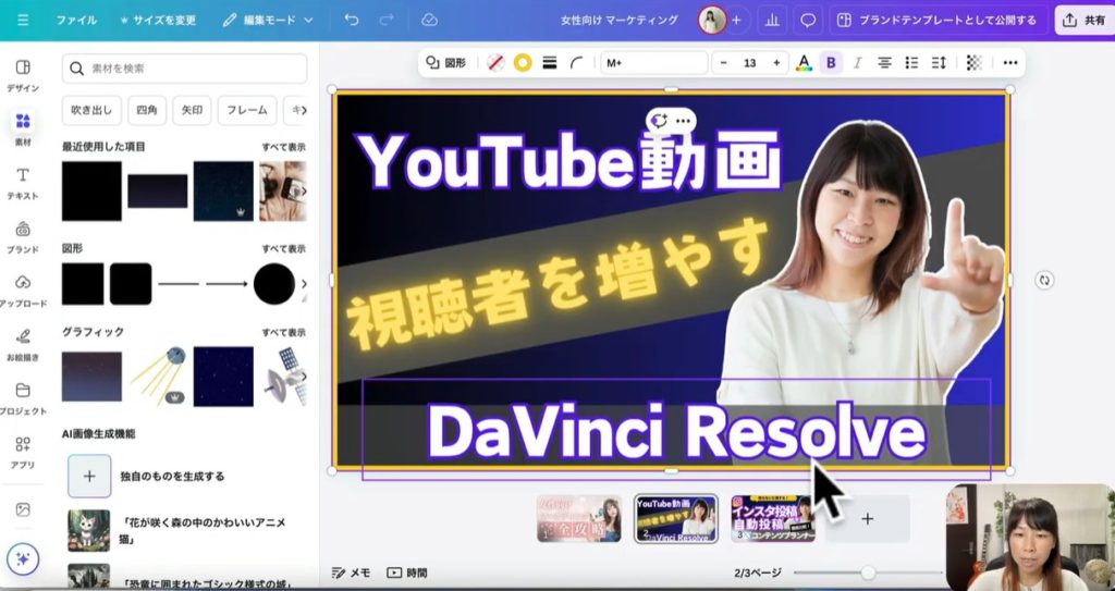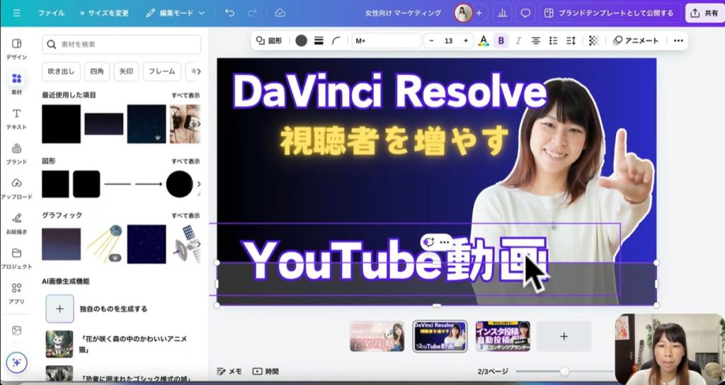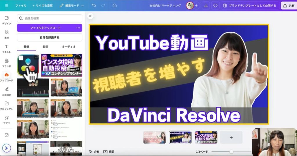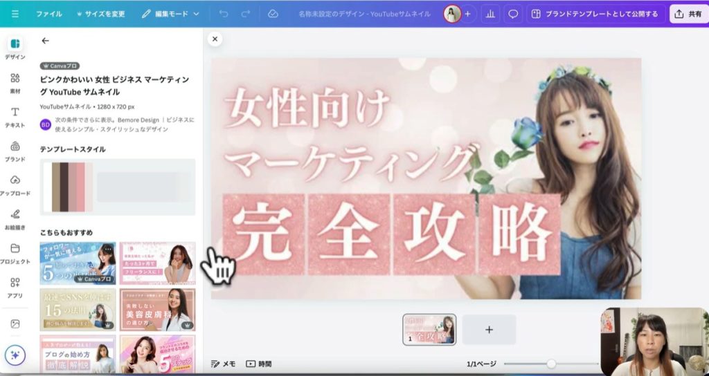女性の画像が表示されているので、こちらを自分のものに変えたり、文字の部分を変更したりするのは可能です。このようにテンプレートを選んで、自分の画像に取り換えたり、文言を自分のコンテンツに合わせたりすれば、非常にサムネイルをスピーディに作成できるはずです。
