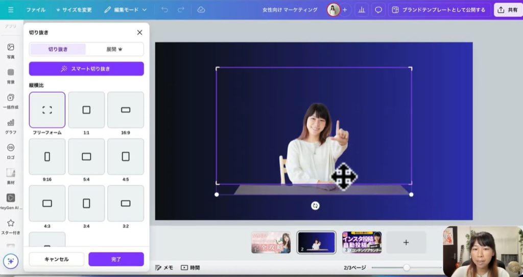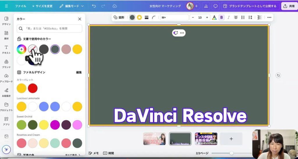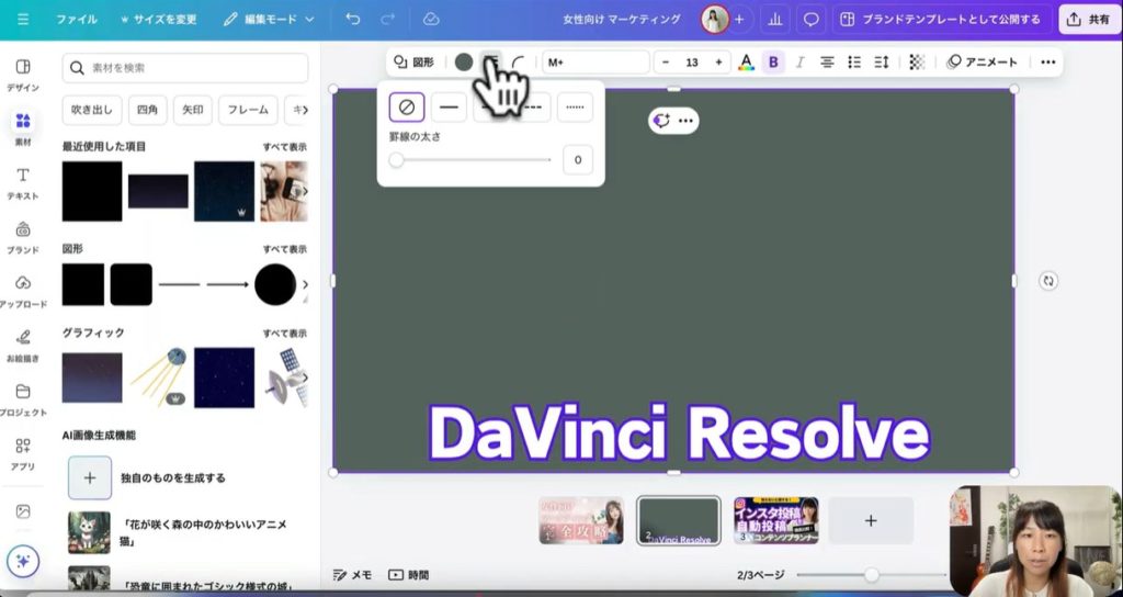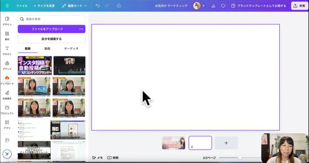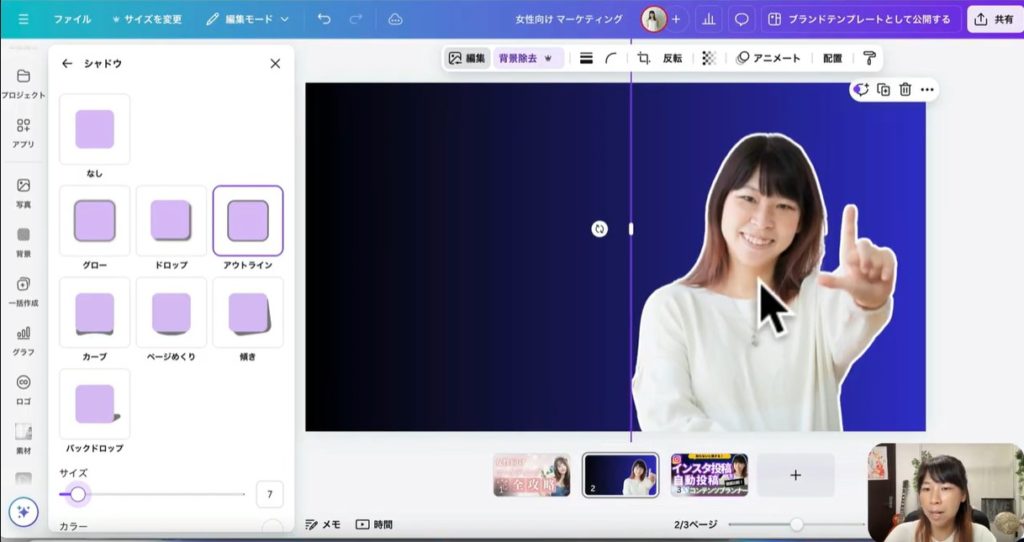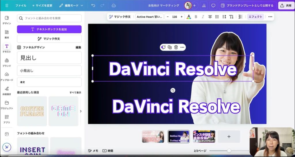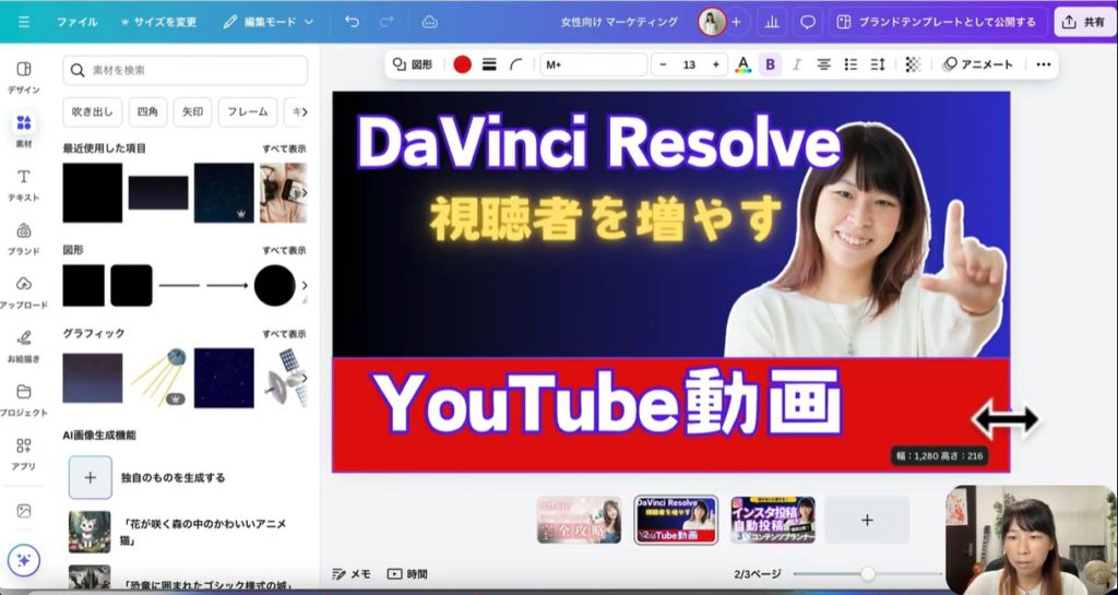 女性の画像が表示されているので、こちらを自分のものに変えたり、文字の部分を変更したりするのは可能です。このようにテンプレートを選んで、自分の画像に取り換えたり、文言を自分のコンテンツに合わせたりすれば、非常にサムネイルをスピーディに作成できるはずです。