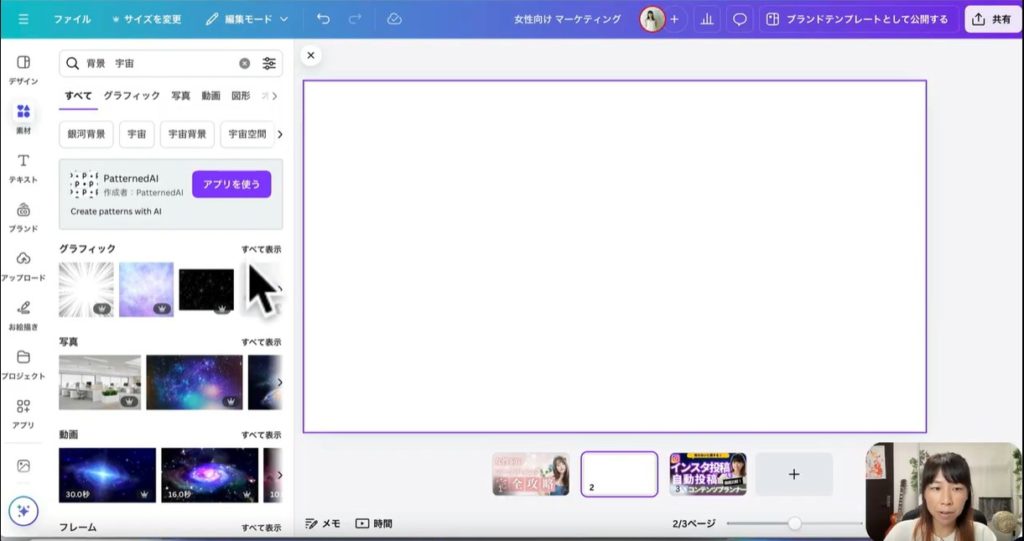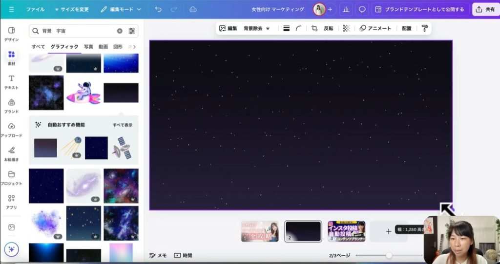上部のところに検索欄がありますので、こちらに自分のイメージするワードを入力してみましょう。今回は背景を宇宙っぽくしたいので、「背景 宇宙」という感じで検索にかけてみました。すると下部に検索キーワードに該当するイメージの候補がいろいろと出てきます。