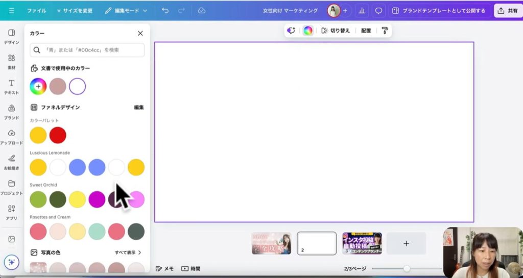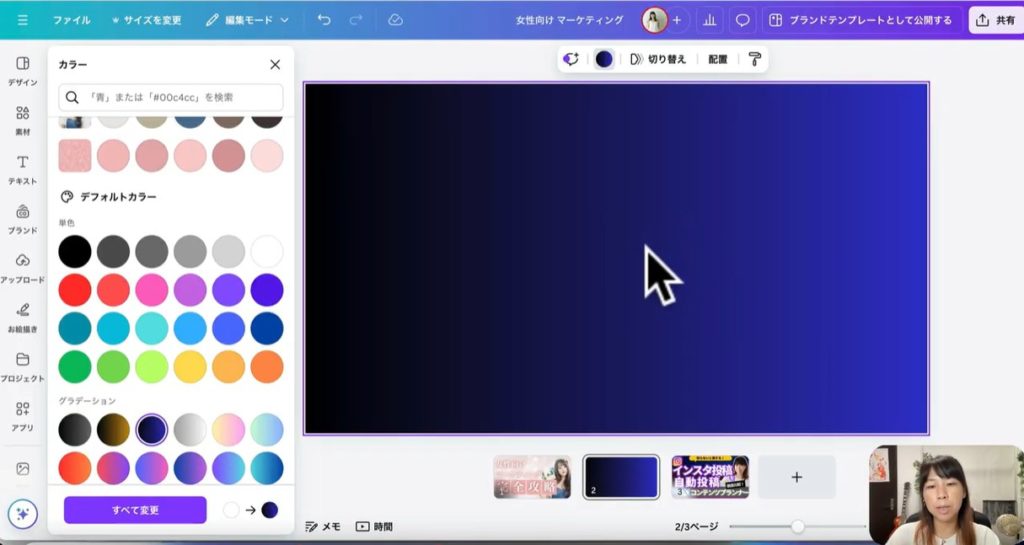 その他にも背景色を選択する方法もあります。上のスクショでグラデーションになった丸いアイコンがあるでしょう。ここをクリックします。すると背景色のメニューが表示されるでしょう。この中にはいろいろな色が用意されているので、好きな色を選ぶのも一つの方法です。