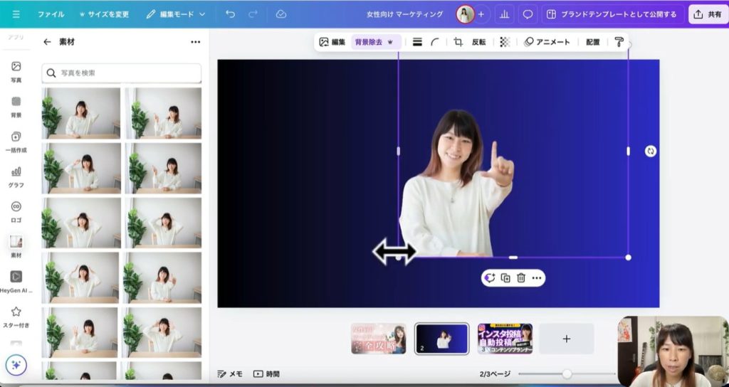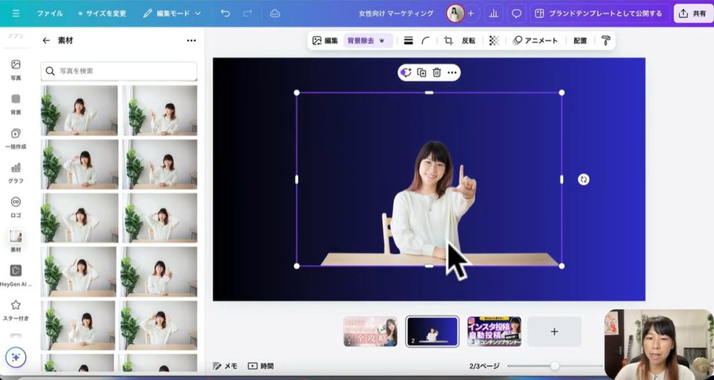 背景除去をクリックしただけで、背景がなくなってもともと用意していた背景素材と人物だけになりました。しかしこれだと、下部の机が邪魔に感じるかもしれません。その場合には画像のところをダブルクリックしましょう。