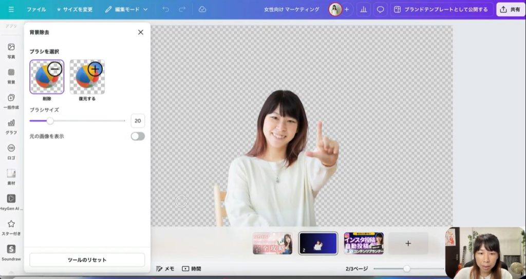 上の画像をご覧ください。カーソルのところに「背景除去」というメニューがあります。こちらをクリックすると、以下のようになります。