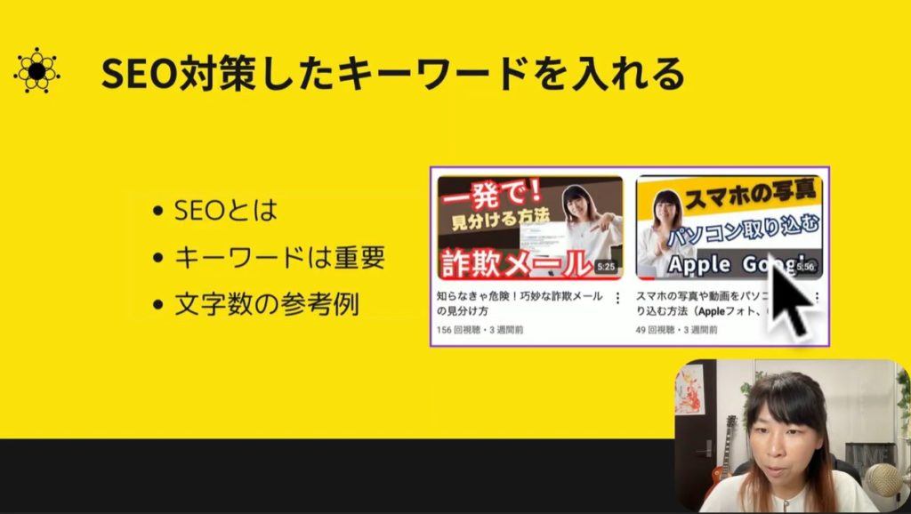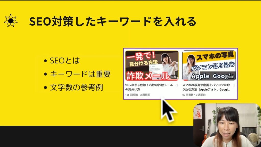 SEOを意識するにあたって、キーワードをどうするかは重要です。特に動画のタイトルにキーワードを入れましょう。もしユーザーがそのキーワードを入力すれば、あなたの動画が出てくるからです。