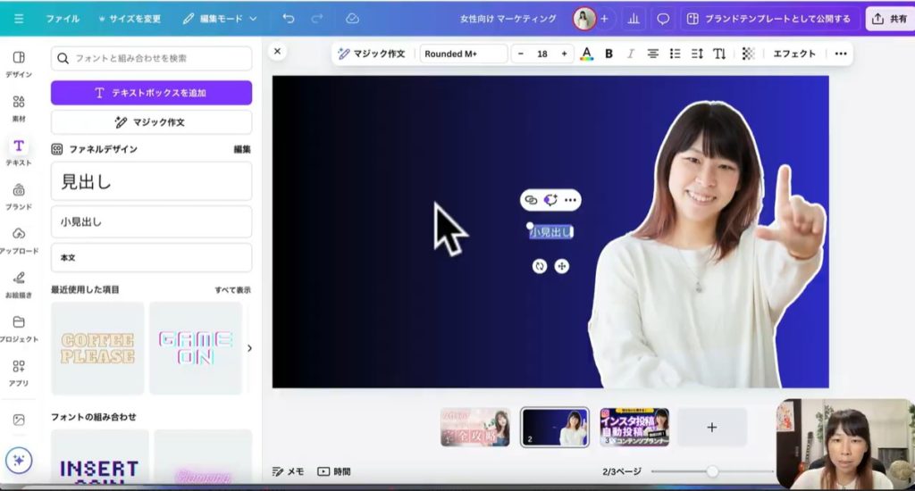 次に文字を入れていきます。左のメニューに「テキスト」があるので、こちらをクリックしてください。すると「ファネルデザイン」というメニューが表示されます。基本的になんでもよいのですが、今回は「小見出し」を使って説明していきます。