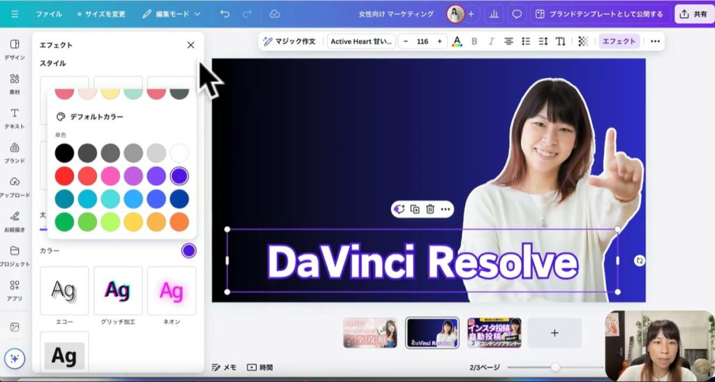 また文字の感じが今一つであれば、上部右側にある「エフェクト」をクリックしてみましょう。すると左側にいろいろな文字のスタイルが表示されるので、イメージにぴったりのものを見つけましょう。