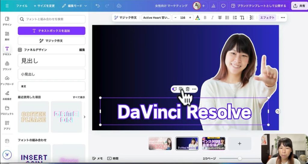 サムネイル作成するにあたって、便利なCanvaの機能があるので紹介します。上のスクショでテキスト部分をクリックすると、上部にメニューが出てきます。真ん中のところ、ちょうどカーソルの指し示しているところにあるアイコンが「複製」機能のものです。こちらをクリックしてみましょう。