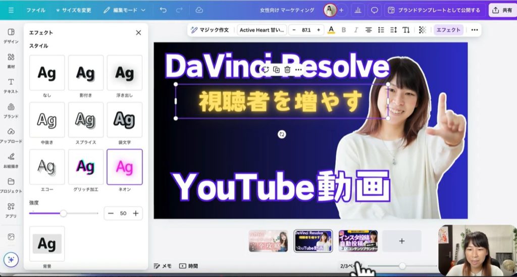 コピーしたテキストも先ほどと同じ要領で、フォントや文字の大きさ、エフェクトを変更できます。カーソルを動かすことで、文字の位置を変更するのも可能です。「YouTube動画」に加えて「視聴者を増やす」のワードも入れてみたところ、以下のように仕上がりました。