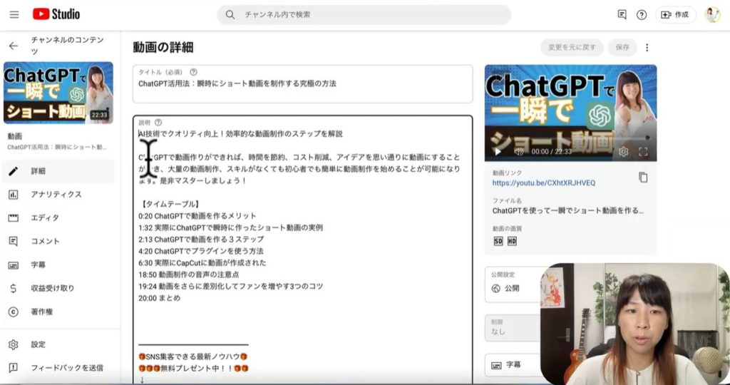 実はこの説明欄にも、意識してキーワードを盛り込むことが重要です。上のスクショでも、説明欄にChatGPTというワードが盛り込まれているでしょう。