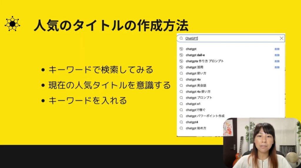 今回の場合、ChatGPTがキーワードです。ChatGPTをタイトルの一番前に持ってくることで、こちらがパワーワードになるわけです。