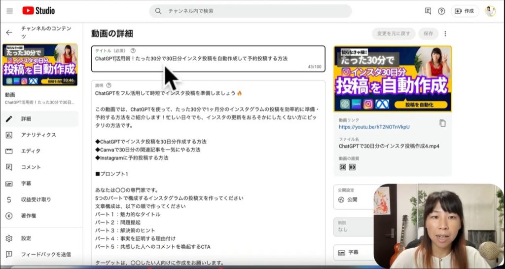 タイトルは「ChatGPT活用法、瞬時にショート動画を制作する究極の方法」としました。ここでポイントになるのは、キーワードを後ろの方ではなくできるだけ前の方に持ってくることです。