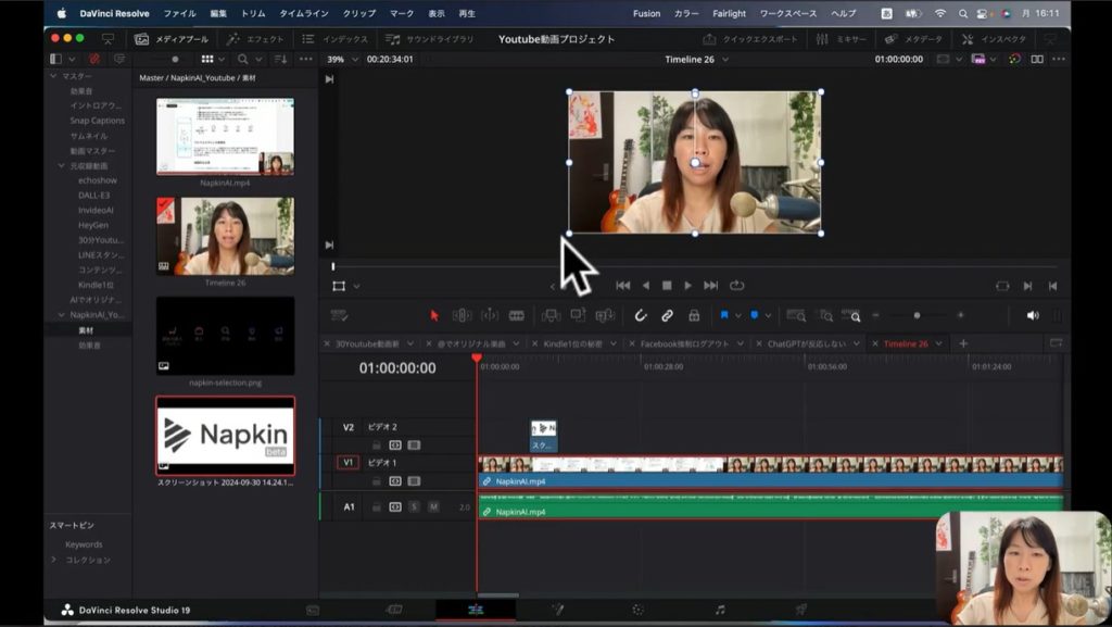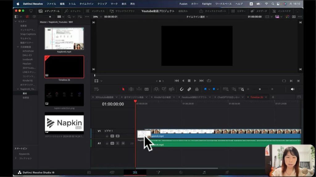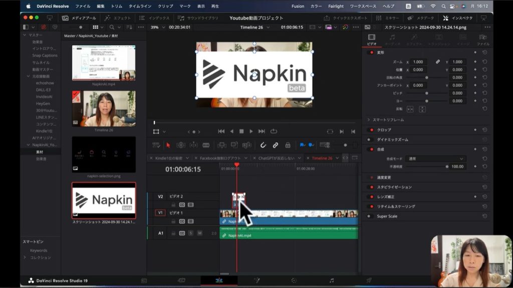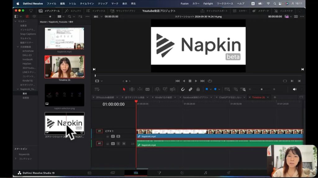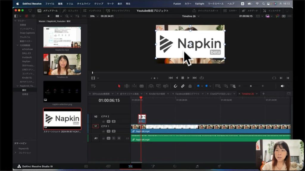 右上のところに「Napkin」と表示された素材がありますね。これは今回の解説動画で用いたロゴです。こちらもタイムラインに取り込んでみましょう。