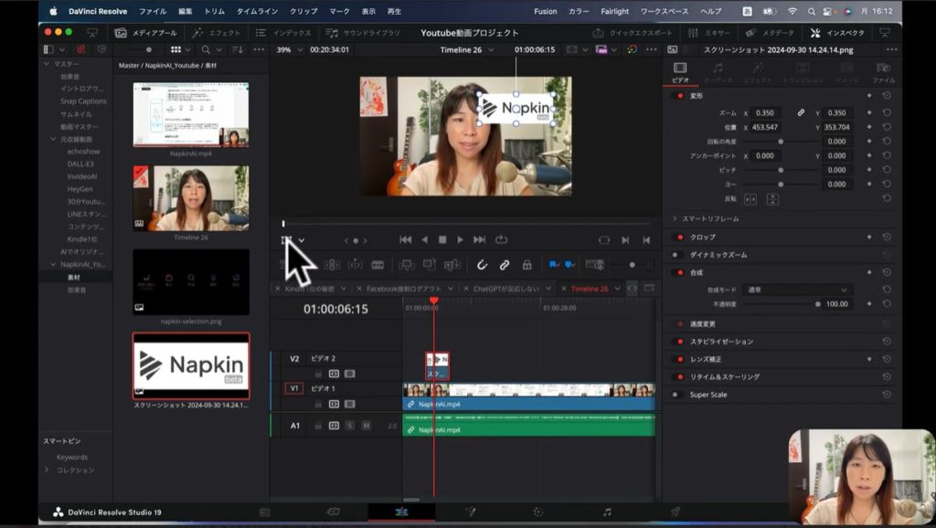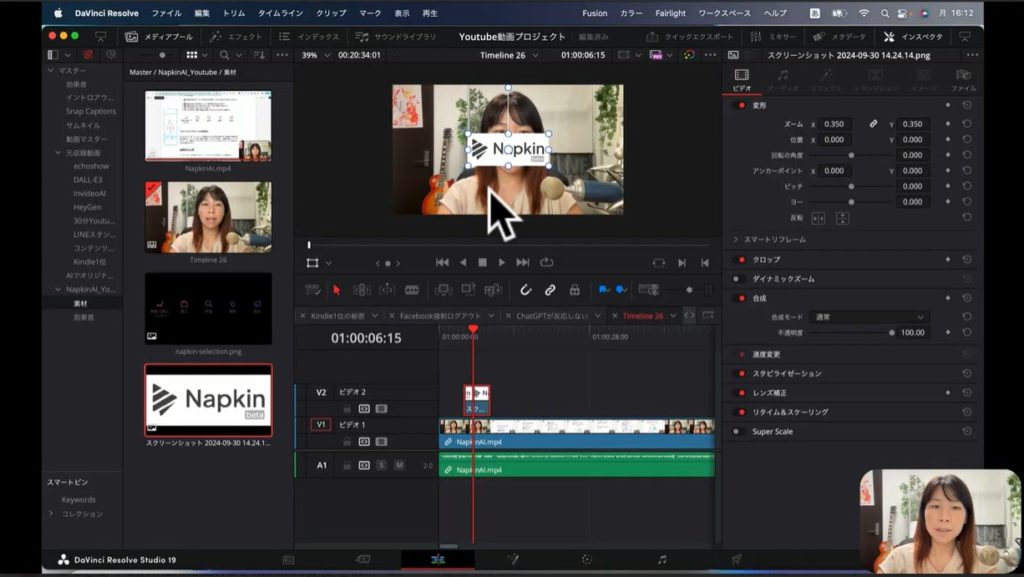 上の画像を見てください。映像の上に「Napkin」のロゴがのっかった状態で表示されています。しかし上の画像だとロゴが大きすぎて、下の映像の部分をほとんど隠してしまっています。ロゴのサイズを調整したければ、「インスペクター」と呼ばれる機能を使用しましょう。
