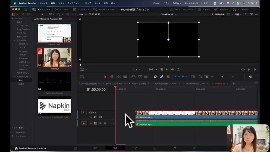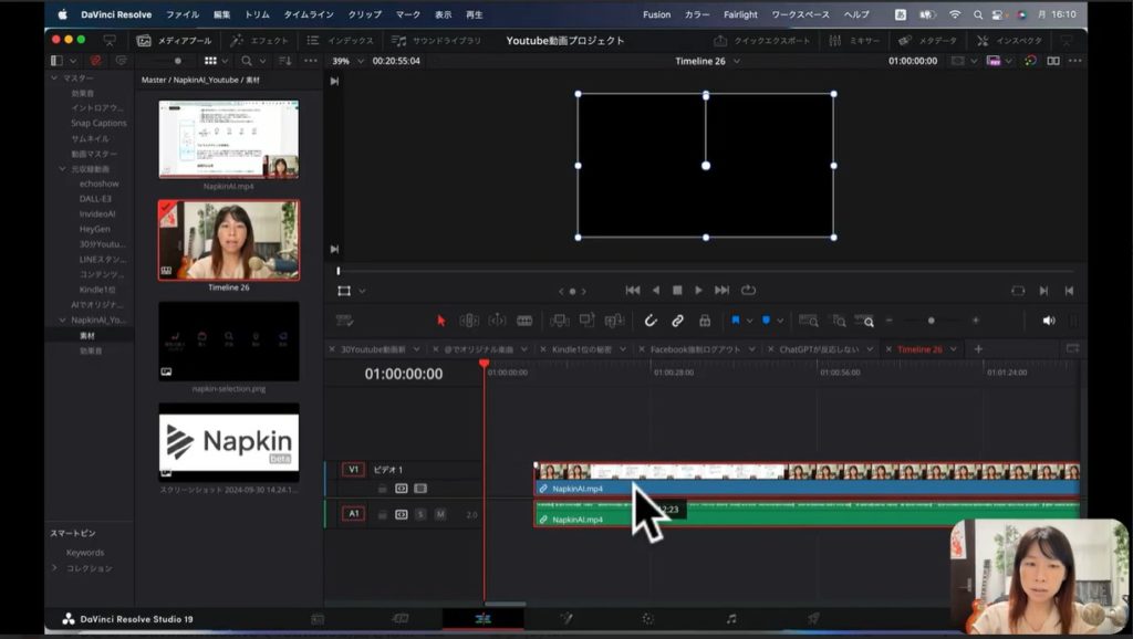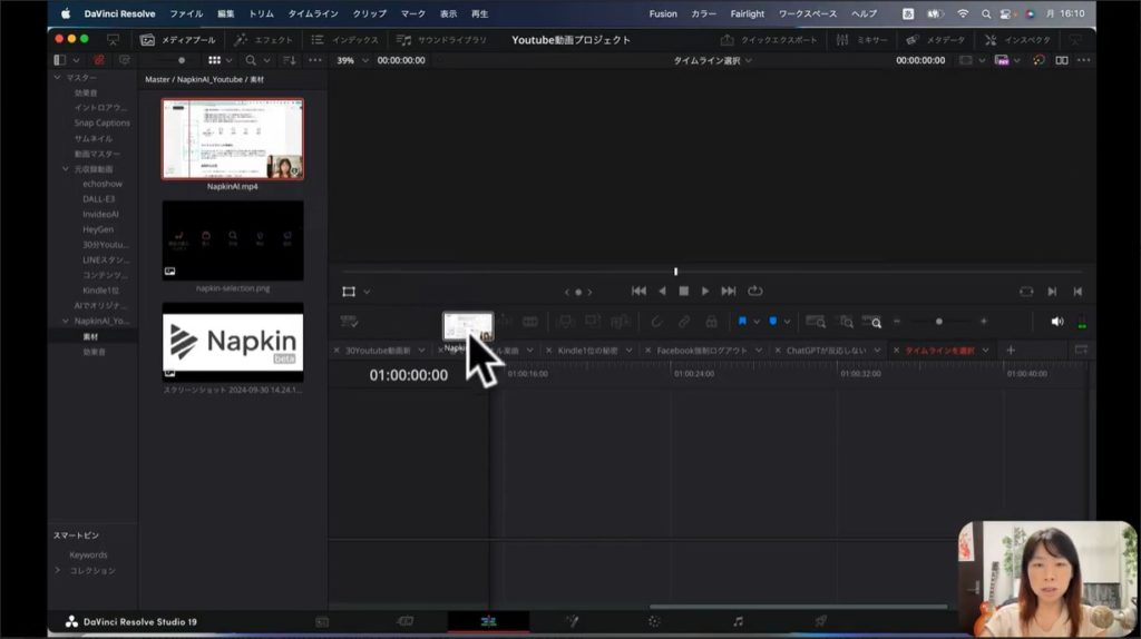 今回は素材の中から左上にある「NapkinAI.mp4」の動画を使って、タイムラインを設置してみたいと思います。「NapkinAI.mp4」を上の画像のようにドラッグして、画面下部にあるタイムラインのところまで持っていってください。