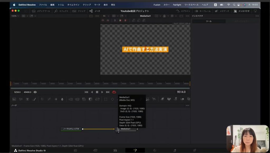 上の画像をご覧ください。「AIで作ったオリジナル楽曲再生中」というテロップの入った映像が表示されています。この状態でインスペクタを開いてみましょう。