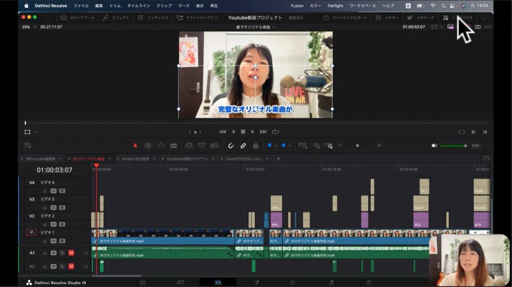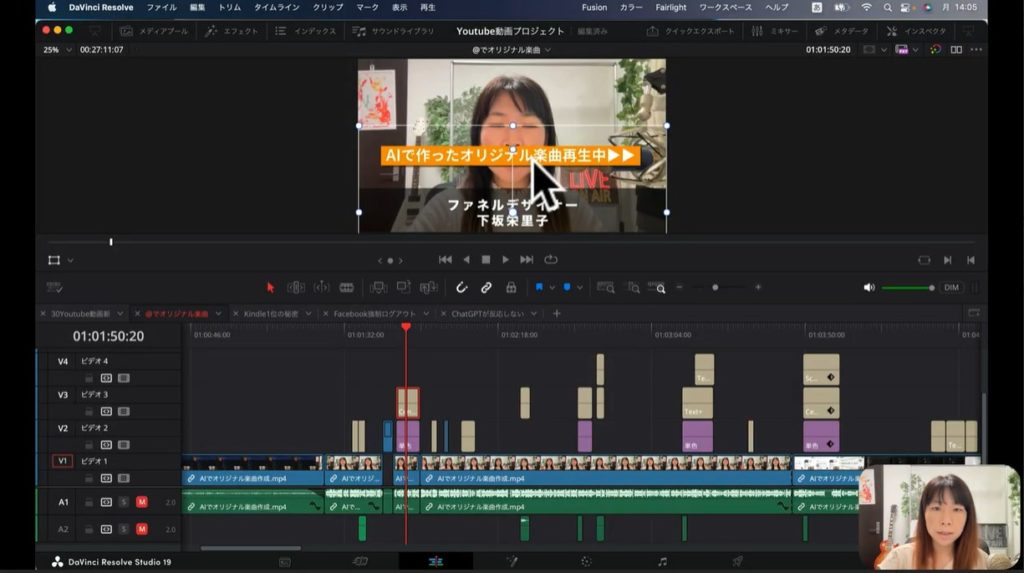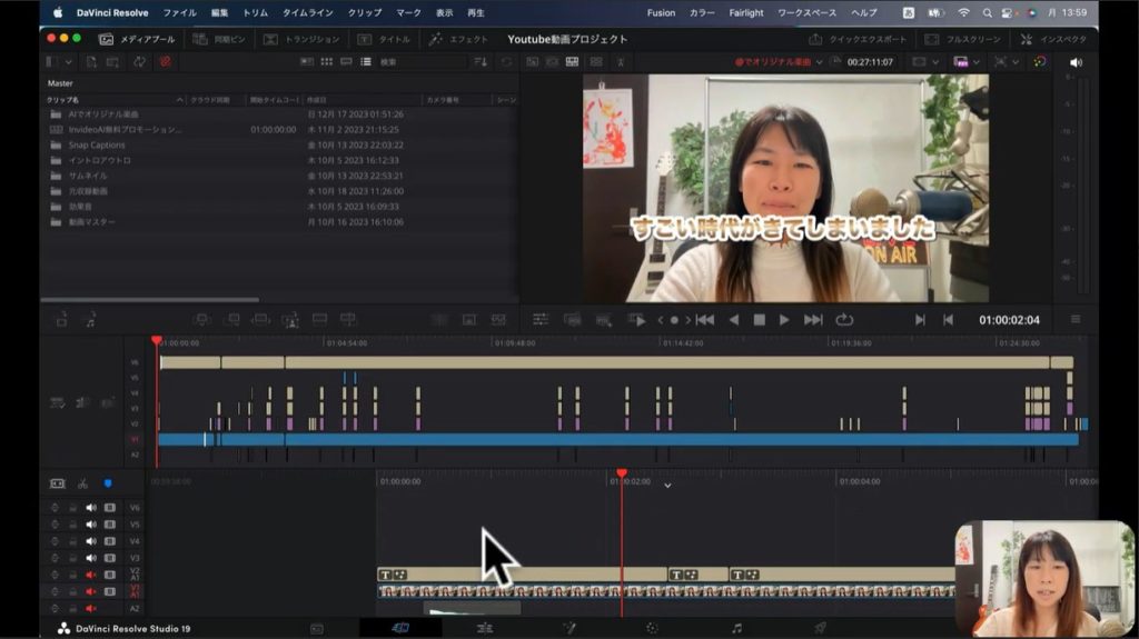 エディット画面は、実際にDavinci Resolveで編集する場合、最もよく使う機能だと思ってください。上の画面の下部のタイムラインの部分を見てください。さまざまなブロックが表示されています。このブロックそれぞれが素材を表しています。YouTube動画制作する際に、いかに多くの素材が使われているかおわかりでしょう。