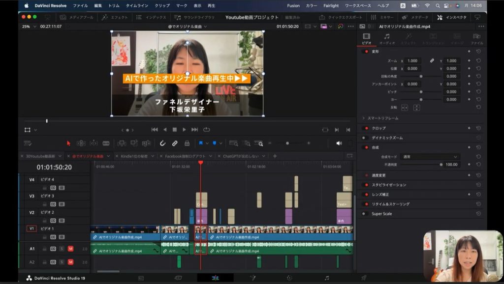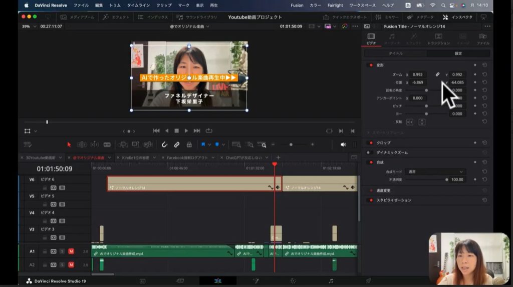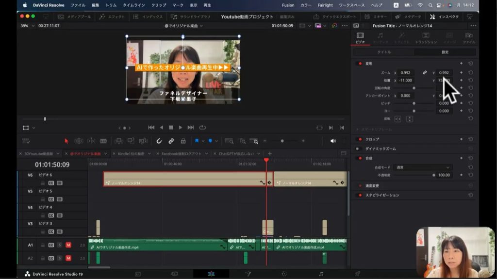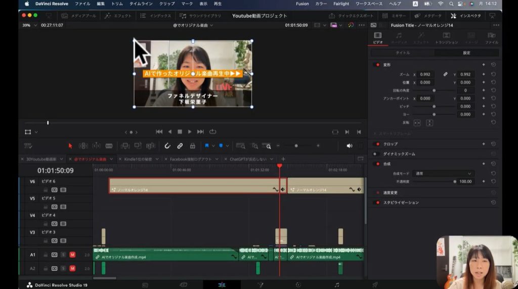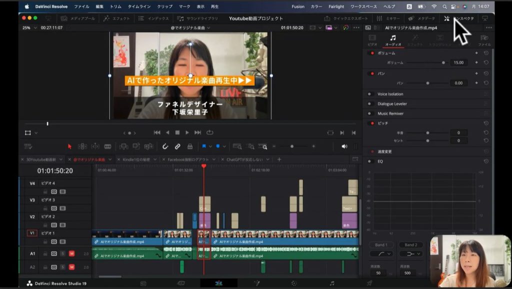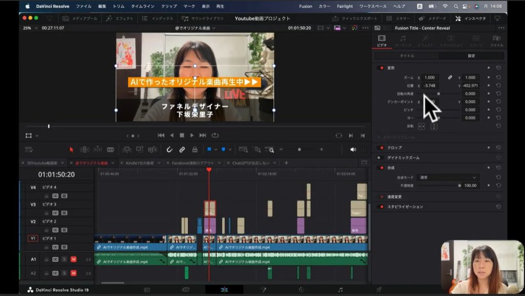 上の画面の下部のタイムラインの部分、赤く囲われているブロックがあるでしょう。この赤く囲われているところは、上の画像の「ファネルデザイナー 下坂栄里子」のテロップの素材に該当します。こちらのブロックを選択して、インスペクタをクリックします。