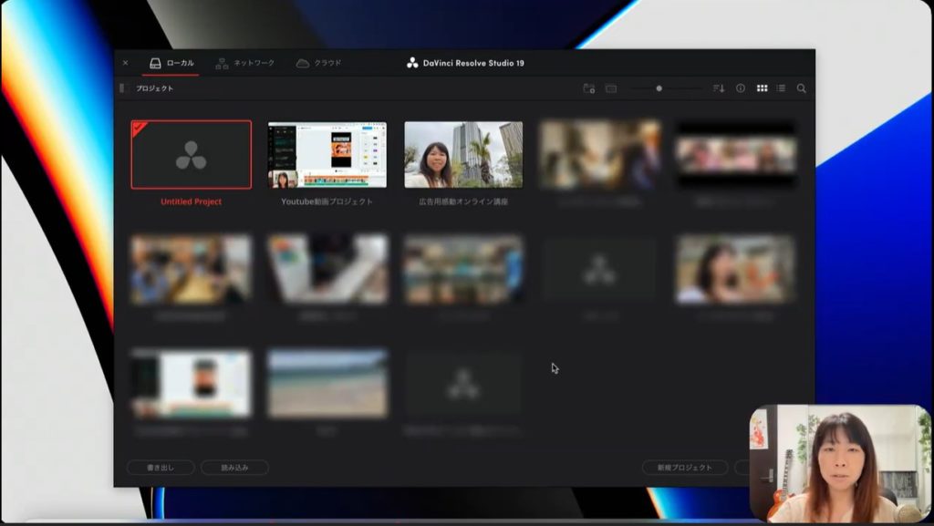 私の画面を見るとおわかりでしょうが、これまでのプロジェクトは上の画面のように保存できます。私の画面を見るとYouTube用や広告用、編集用などいろいろなプロジェクトがあります。このようにDavinci Resolveではプロジェクトごとに管理していくと思ってください。