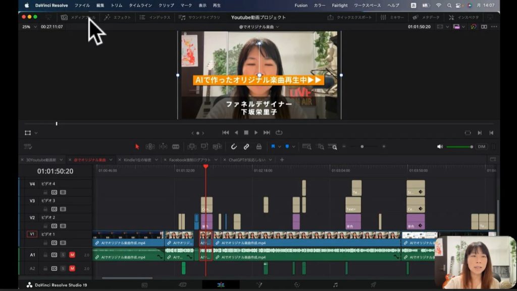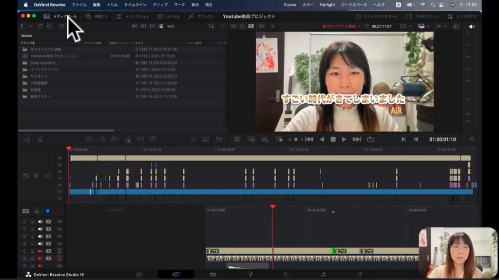 Davinci Resolveの特徴として見逃せないのは、カットや編集を別々の項目で指示できる点です。下のスクショを見てください。カーソルのある部分、左下のアイコンは「メディア」のメニューです。こちらをクリックすると、以下のような画面に変わるはずです。