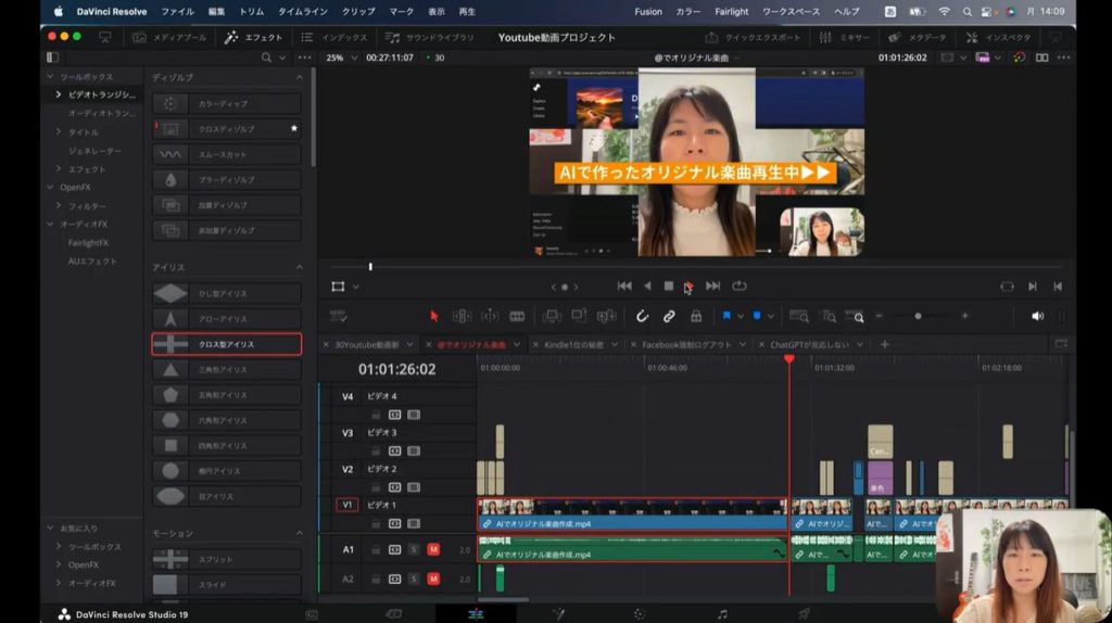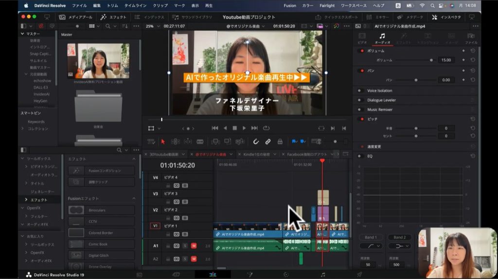 いろいろと機能を試してみるのも、YouTube動画を編集するうえでおすすめです。さまざまなエフェクトを再生することで、「こういうのもあるのか」とわかるからです。今回は楽しい動画を作るために必要な最低限のことだけをお伝えしたいので、ここでは割愛します。しかしDavinci Resolveにはここで紹介した以外のさまざまな機能があるので、実際にどのような効果があるのか使ってみましょう。