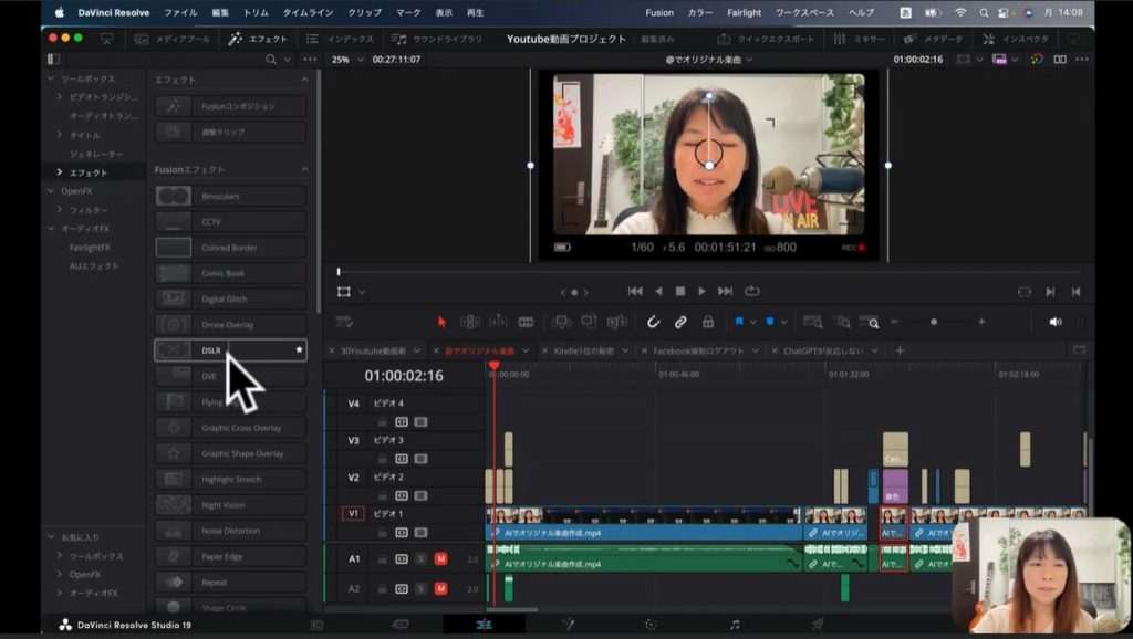 Davinci ResolveでYouTube動画の編集をする際には、エフェクトもしばしば利用するので覚えておきましょう。エフェクトは動画に効果を加えるときに用います。