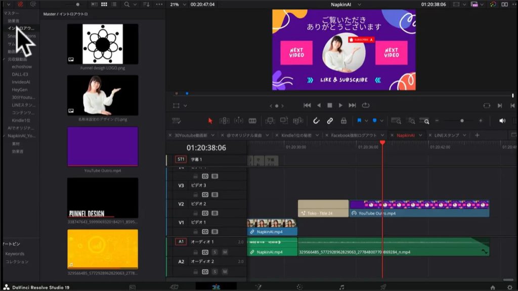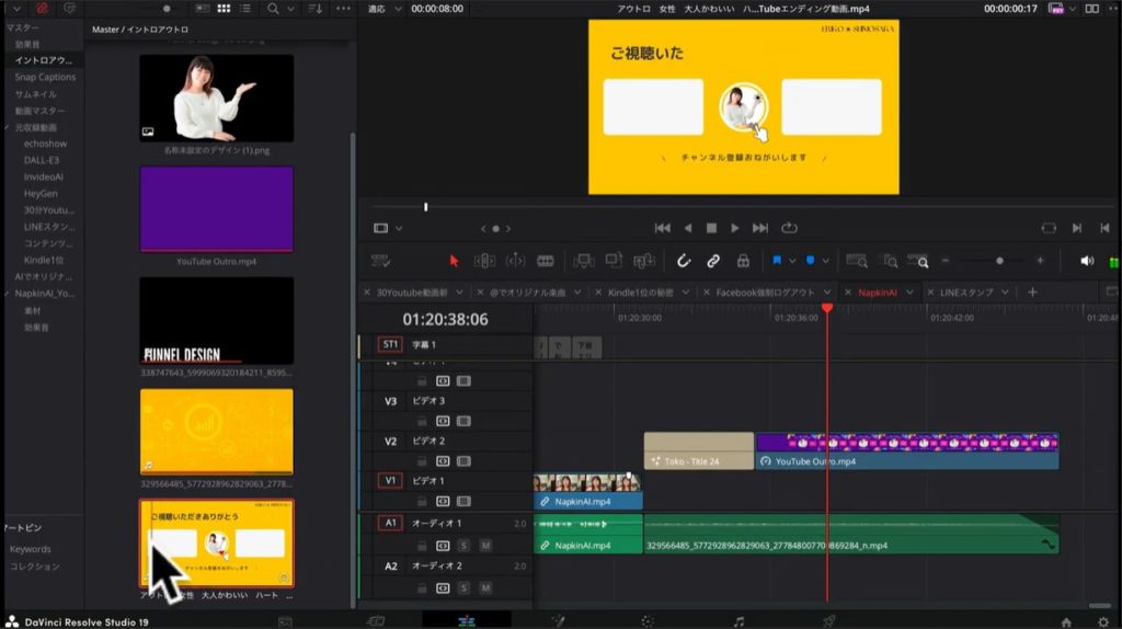 今回はもともとのYouTube動画の最後に、Canvaで作成したアウトロを入れる方法について紹介しました。ここで見てきたように、Davinci Resolveを使用すればそれほど難しくなく、アウトロを付け足せるはずです。