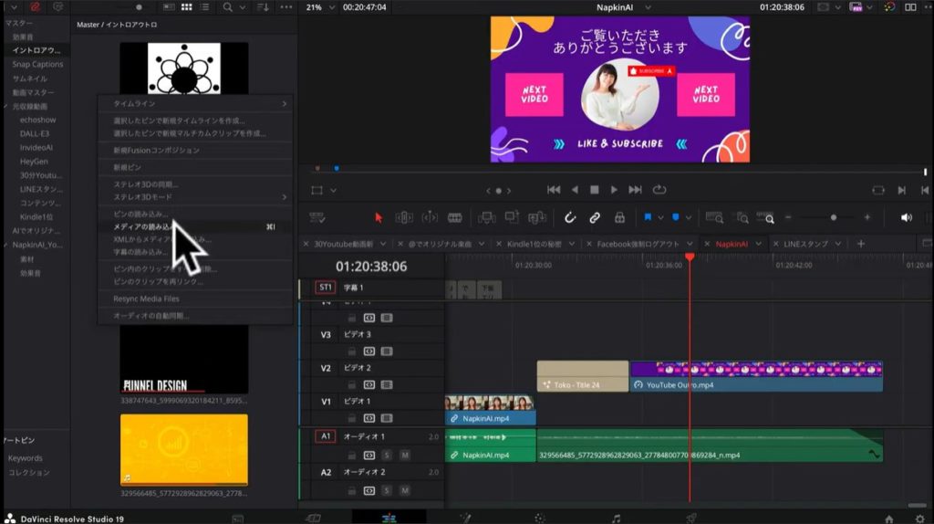 では実際に先ほど制作したCanvaのアウトロ素材をDavinci Resolveに読み込んでいきましょう。以下のスクショのように右クリックすると「メディアの読み込み」というメニューが表示されるはずです。こちらを選択しましょう。