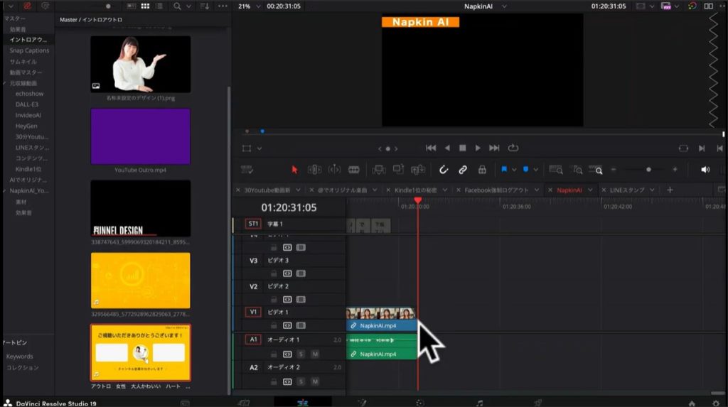 Canvaで作成したアウトロをダウンロードして、Davinci Resolveの方で実際に作業を進めていきます。まずはCanvaで作成したアウトロをDavinci Resolveにアップロードしてください。