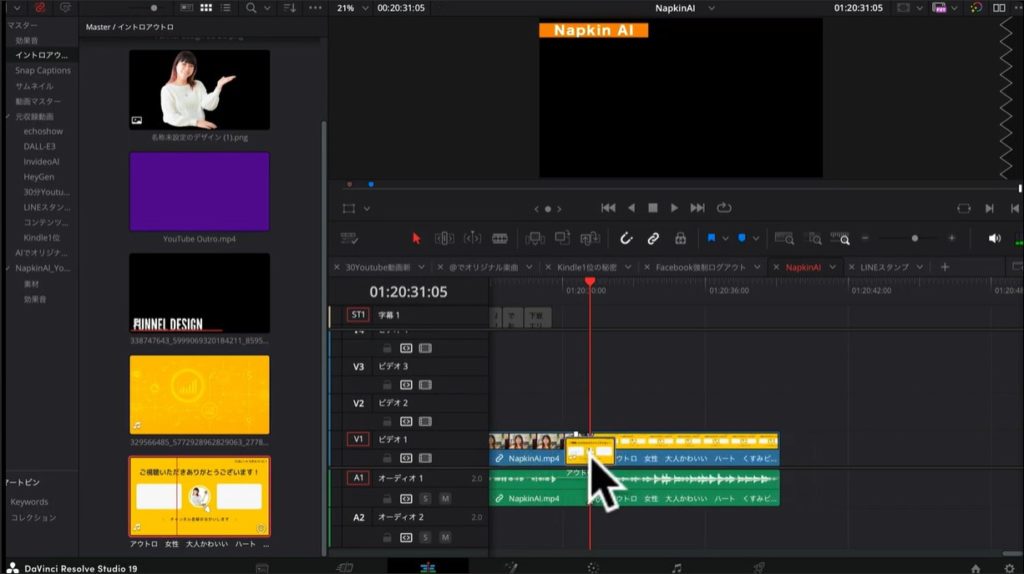 これから何本もYouTube動画を製作しようと思っているのであれば、イントロアウトロ専用のビンを作っておくと動画の整理もしやすいです。また同じアウトロ素材を複数のYouTube動画で使いまわしやすくなります。