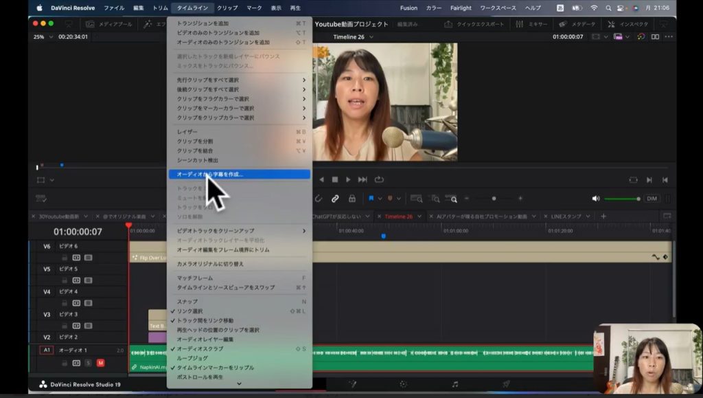 それでは動画に実際に字幕を入れていきましょう。上部バーに「タイムライン」というメニューがあるはずです。こちらをクリックすると以下のスクショのように、いろいろなメニューが表示されます。この中の「オーディオから字幕を作成」をクリックしてください。