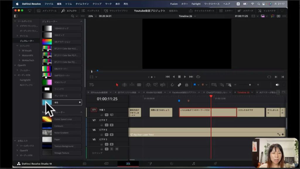 帯を入れる方法は前にもやったことがありますが、「エフェクト」→「ジェネレーター」の順番でクリックしましょう。すると上のスクショのように「単色」というメニューが表示されます。そしてドラッグして、先ほど新規作成したビデオ7のところに持ってきてください。