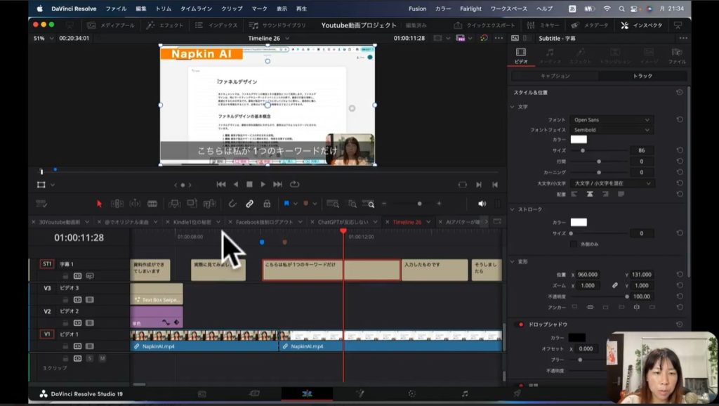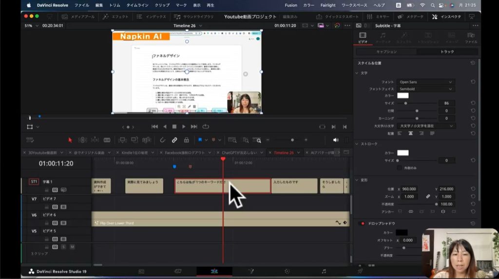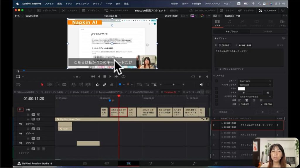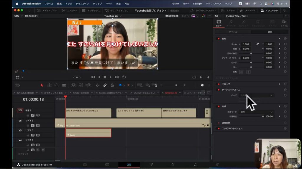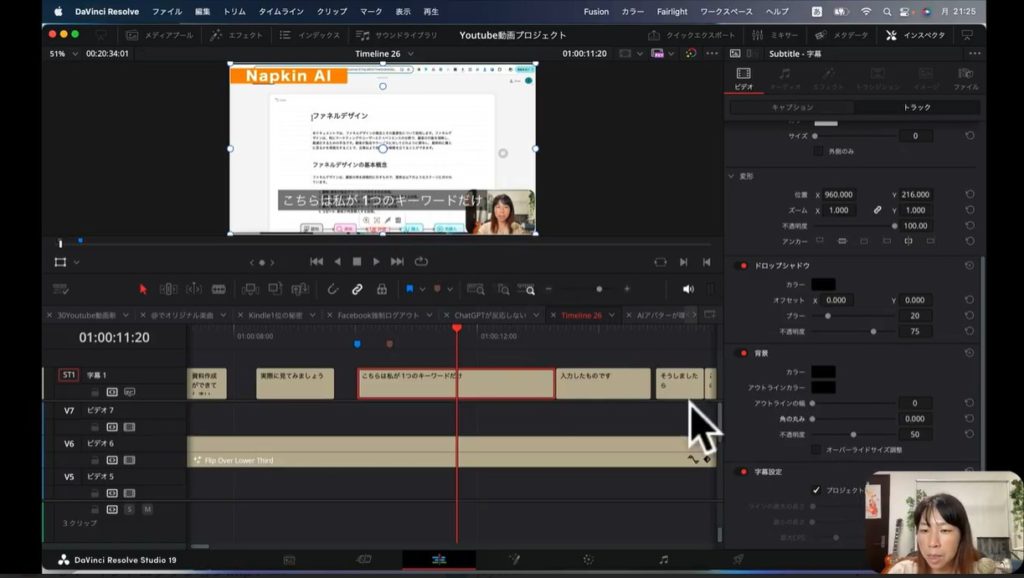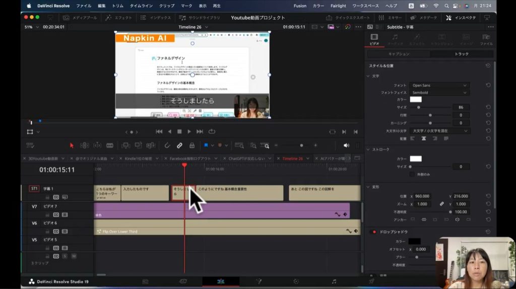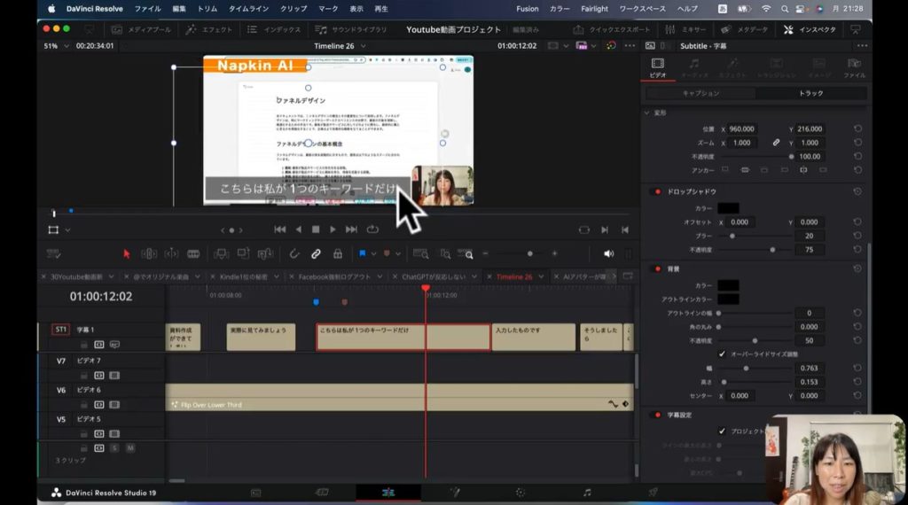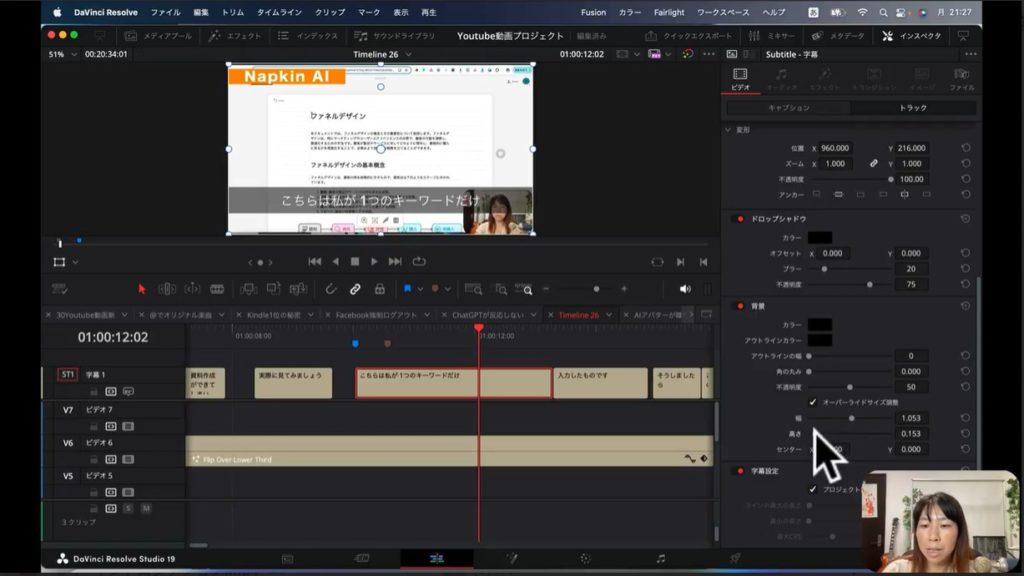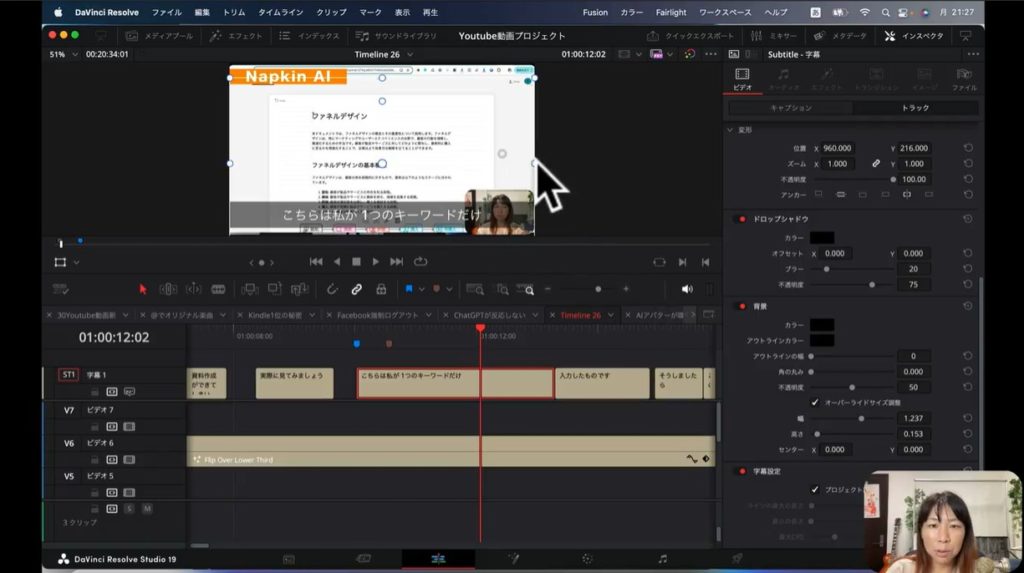 右下のワイプに字幕が被ることがなくなり、私の表情も見やすくなりましたね。しかしこれで作業は完了ではありません。実は特定の場面に合わせてカスタマイズしたことで、ほかのところでも同様の位置に字幕と背景が表示されています。