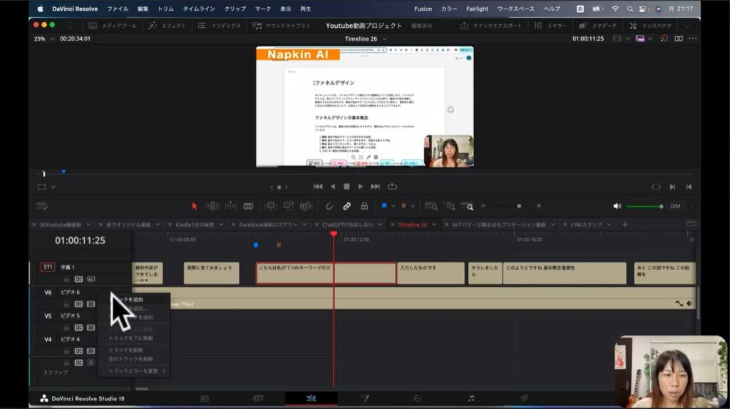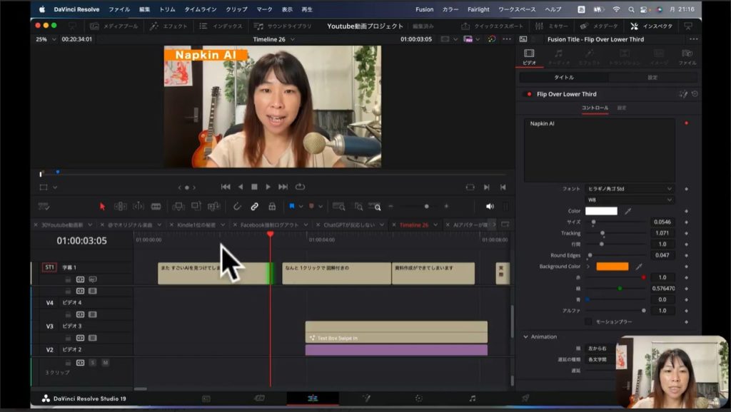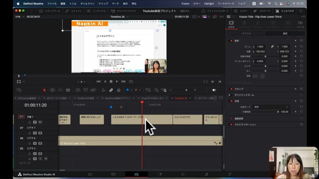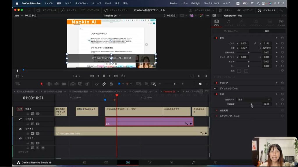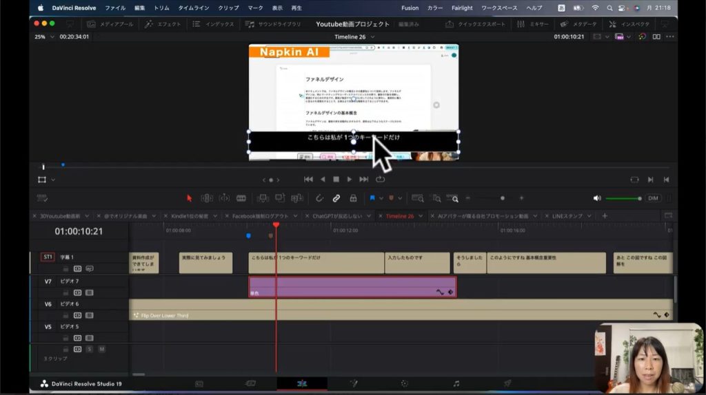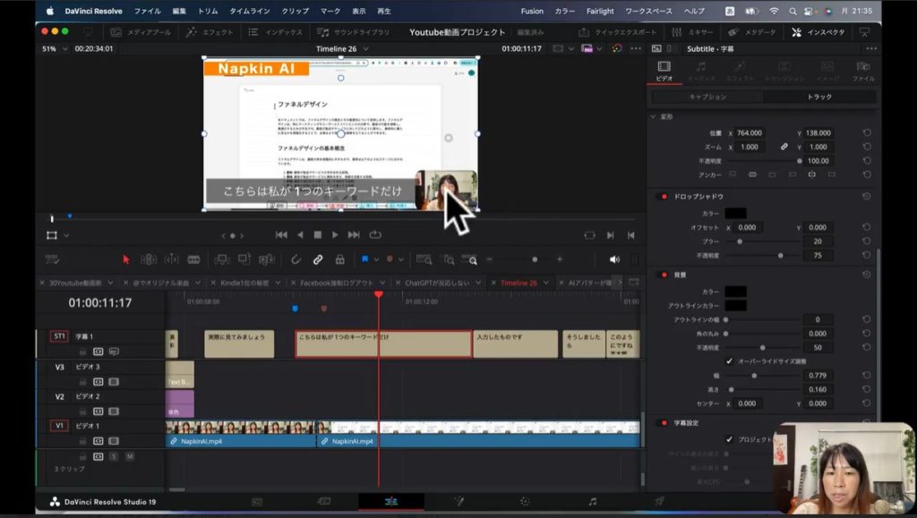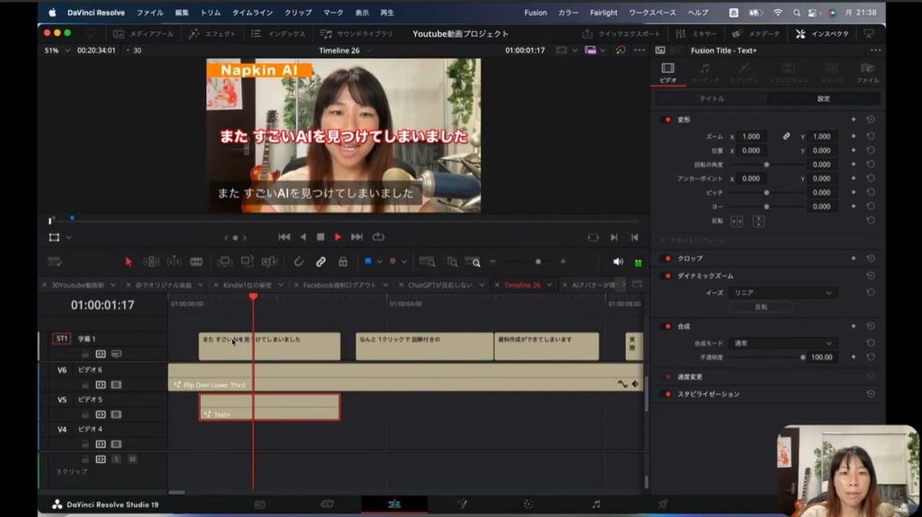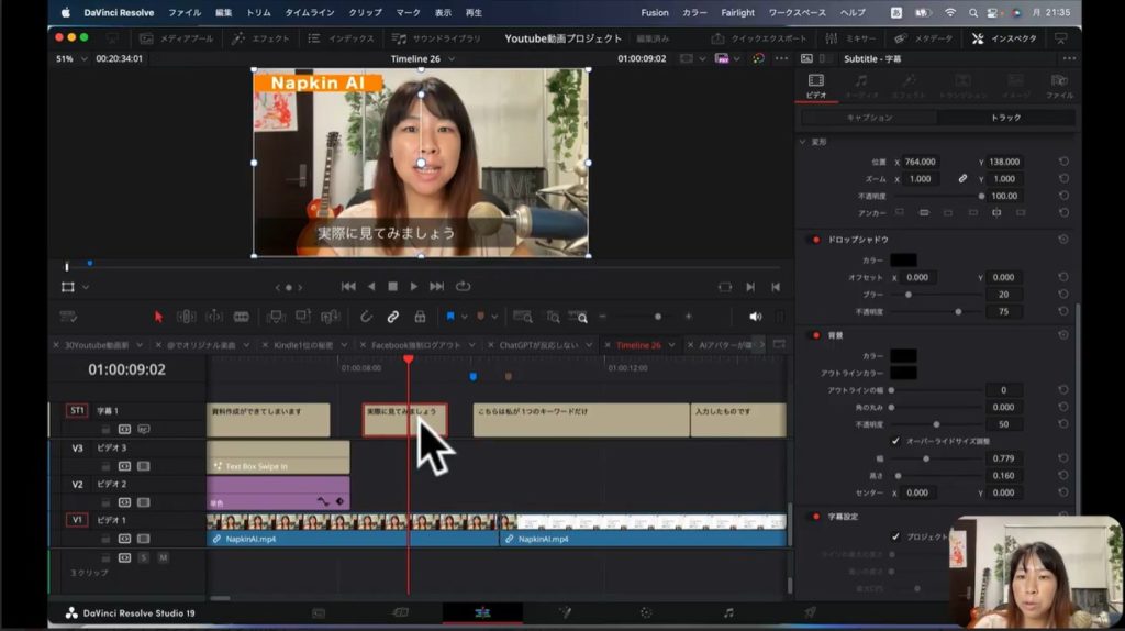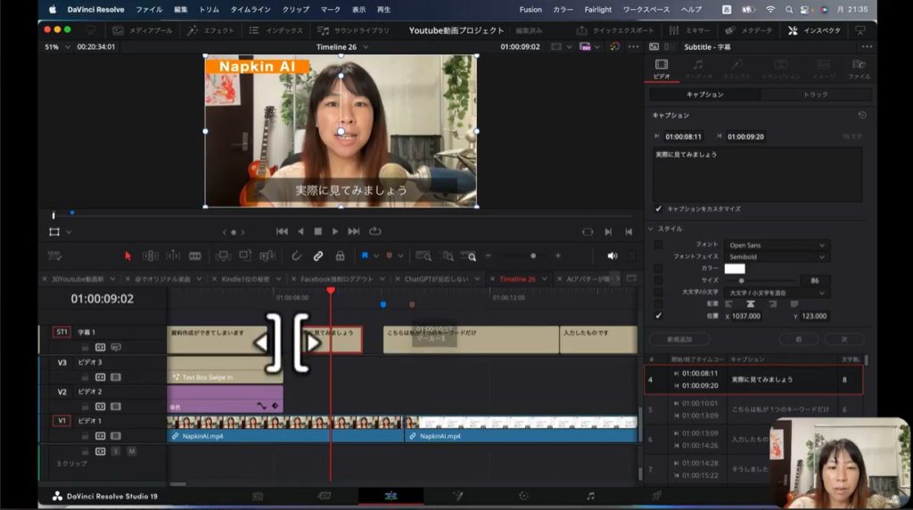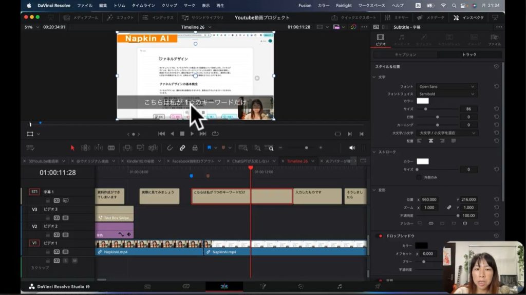 右下のワイプに字幕が被ることがなくなり、私の表情も見やすくなりましたね。しかしこれで作業は完了ではありません。実は特定の場面に合わせてカスタマイズしたことで、ほかのところでも同様の位置に字幕と背景が表示されています。