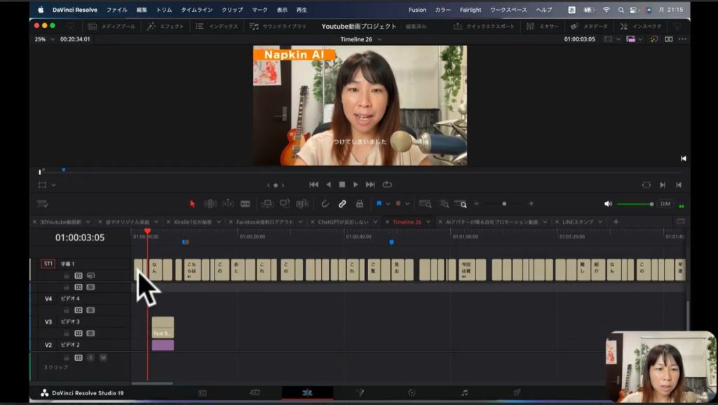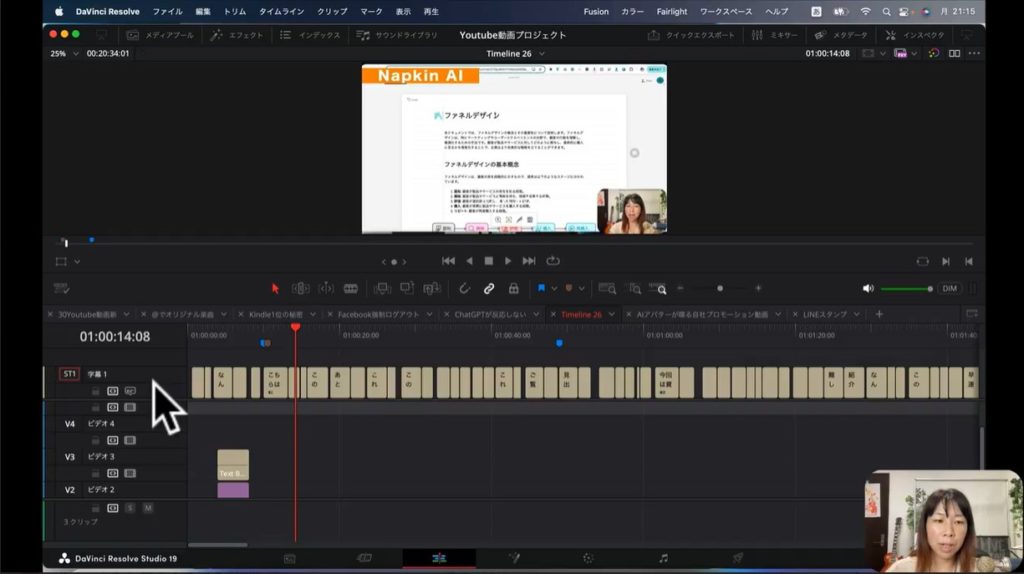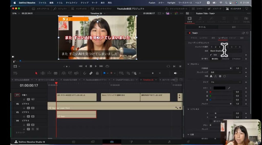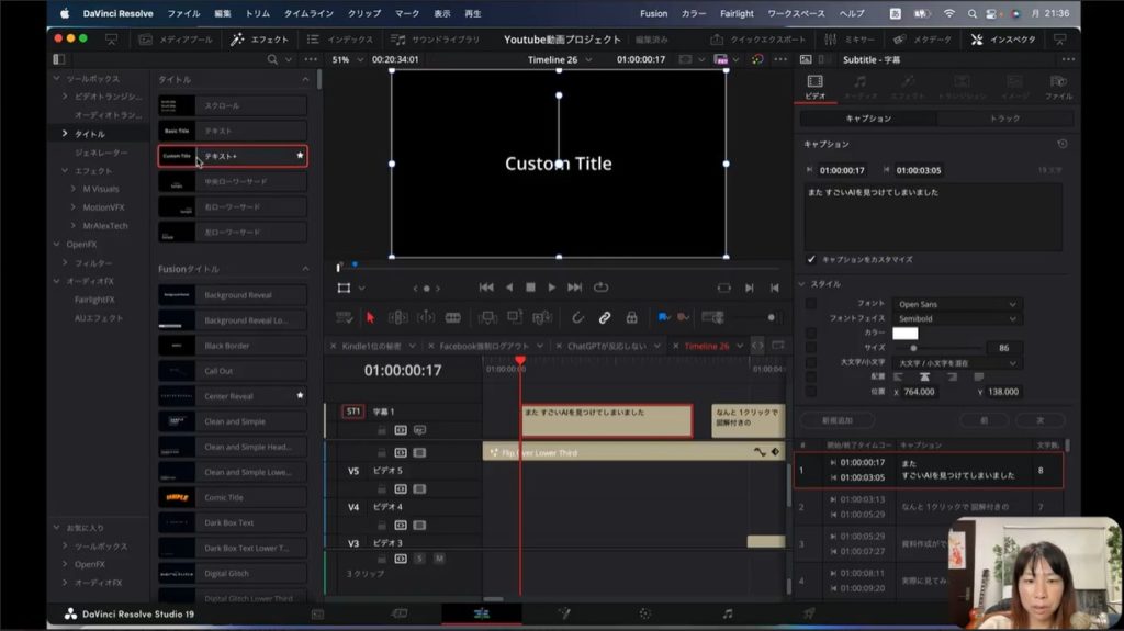 字幕を映像の下に持ってきたのですが、新たな問題が起こりました。これは私のYouTube動画特有の問題で、右下に私の顔を盛り込むレイアウトにしているため、字幕の背景と私の表情がかぶって見えにくくなっています。もしこのような問題が起こらなければ、これからの工程はスルーしていただいて構いません。