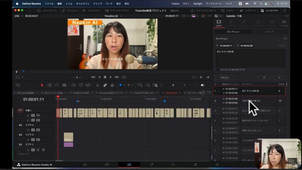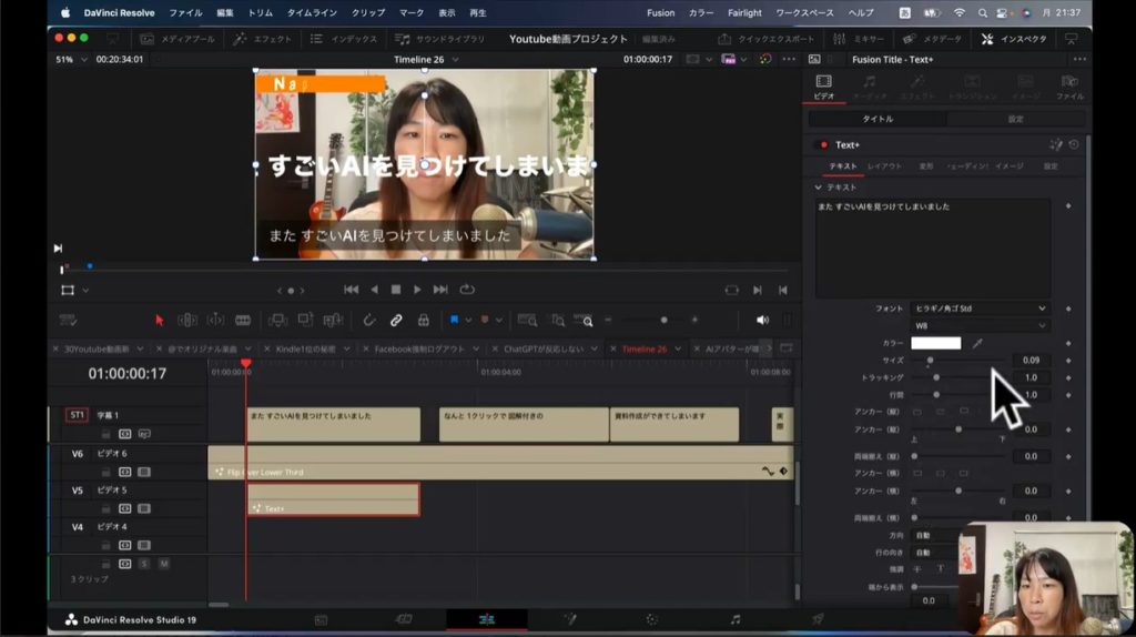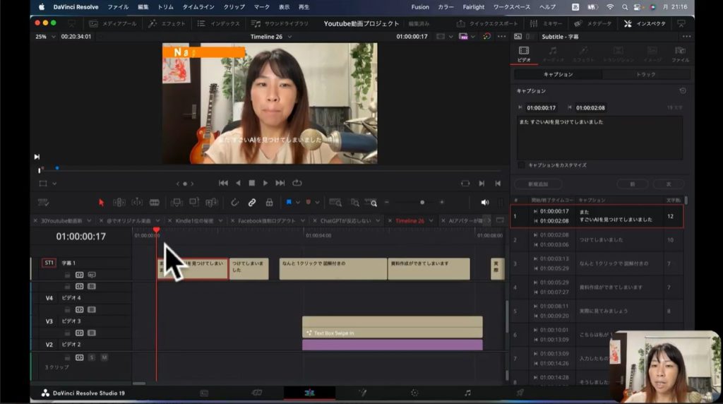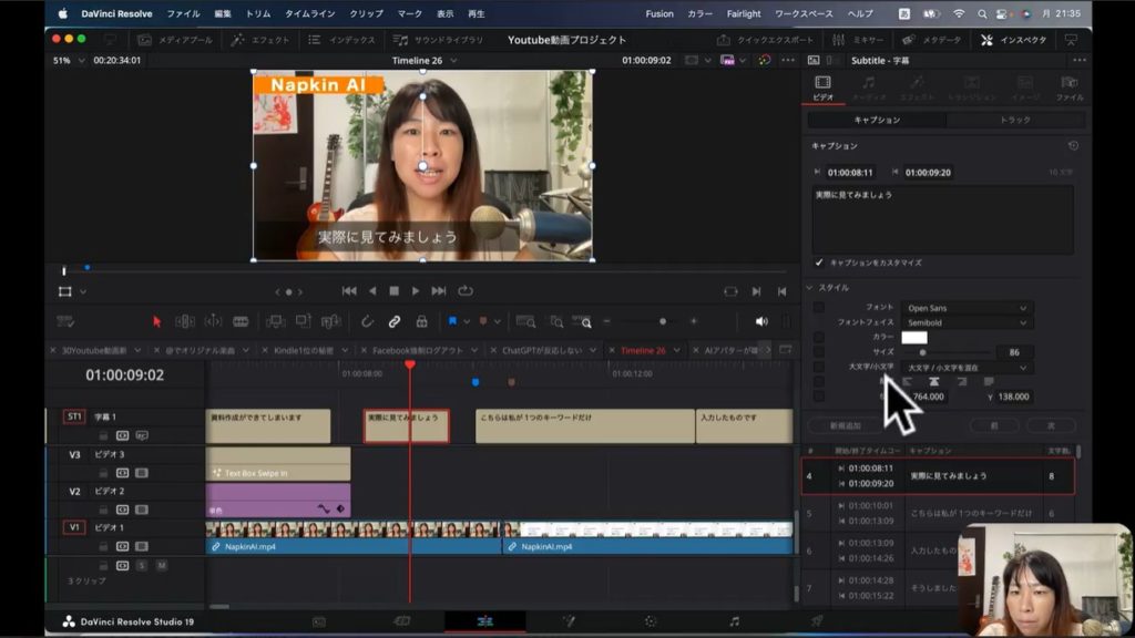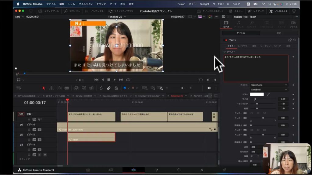 上の画像をご覧ください。「またすごいAIを見つけてしまいました」と字幕を変更しました。すると、左の映像の字幕も「またすごいAIを見つけてしまいました」に変更されました。このように字幕の間違っている部分があれば、インスペクタで変更しましょう。