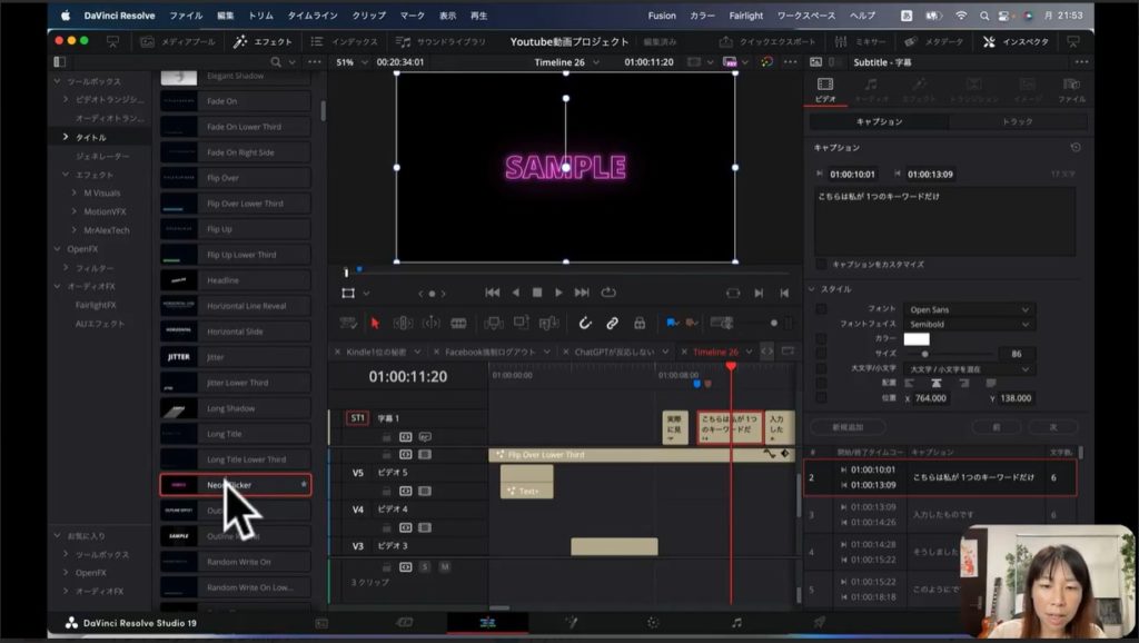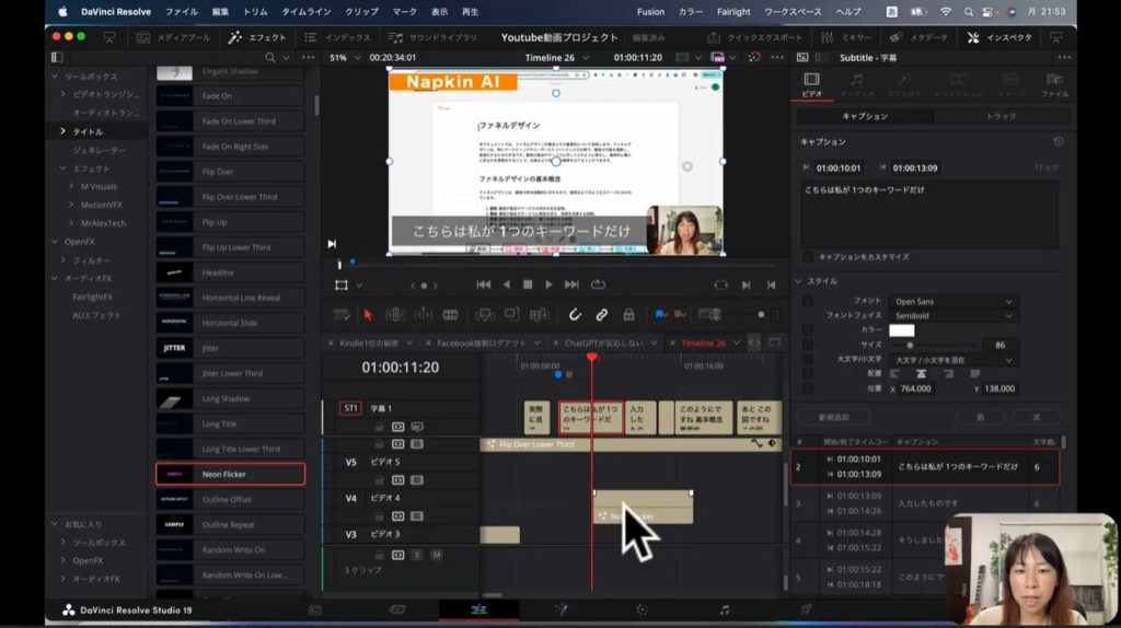 キーワードを強調する字幕を入れるには、「エフェクト」をまずはクリックしてください。「タイトル」を選択するといろいろなメニューが出てくるので、今回は以下のスクショのように「Neo Flicker」を選択してみました。