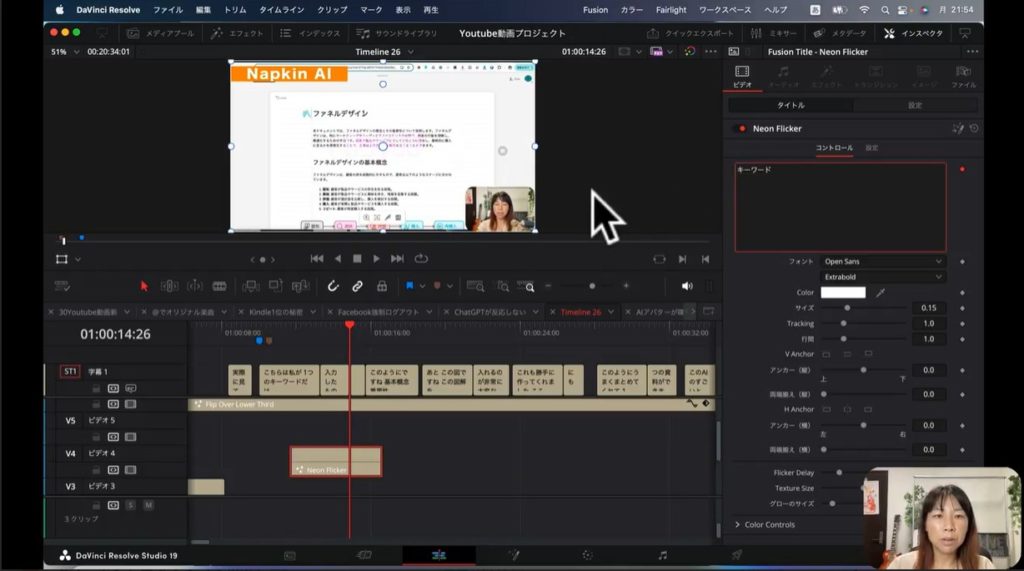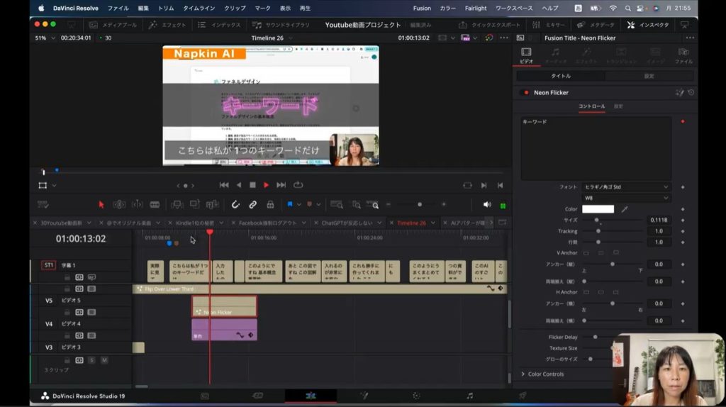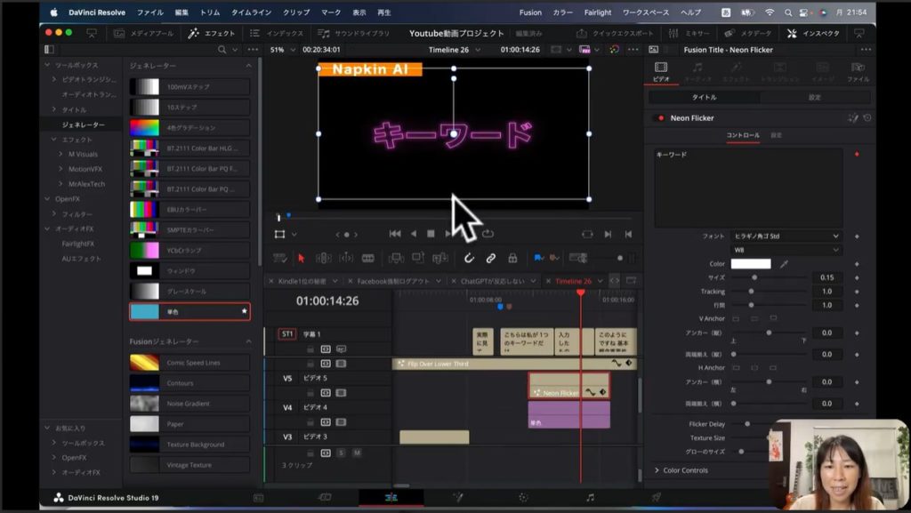 このように「キーワード」という表示が、かなり目立つようになったと思います。しかしこのままではまだバランスに問題があるので、さらに微調整を進めていきます。キーワードはタイムラインの「Neon Flicker」というところにあるので、こちらをクリックしてインスペクタを選択してください。